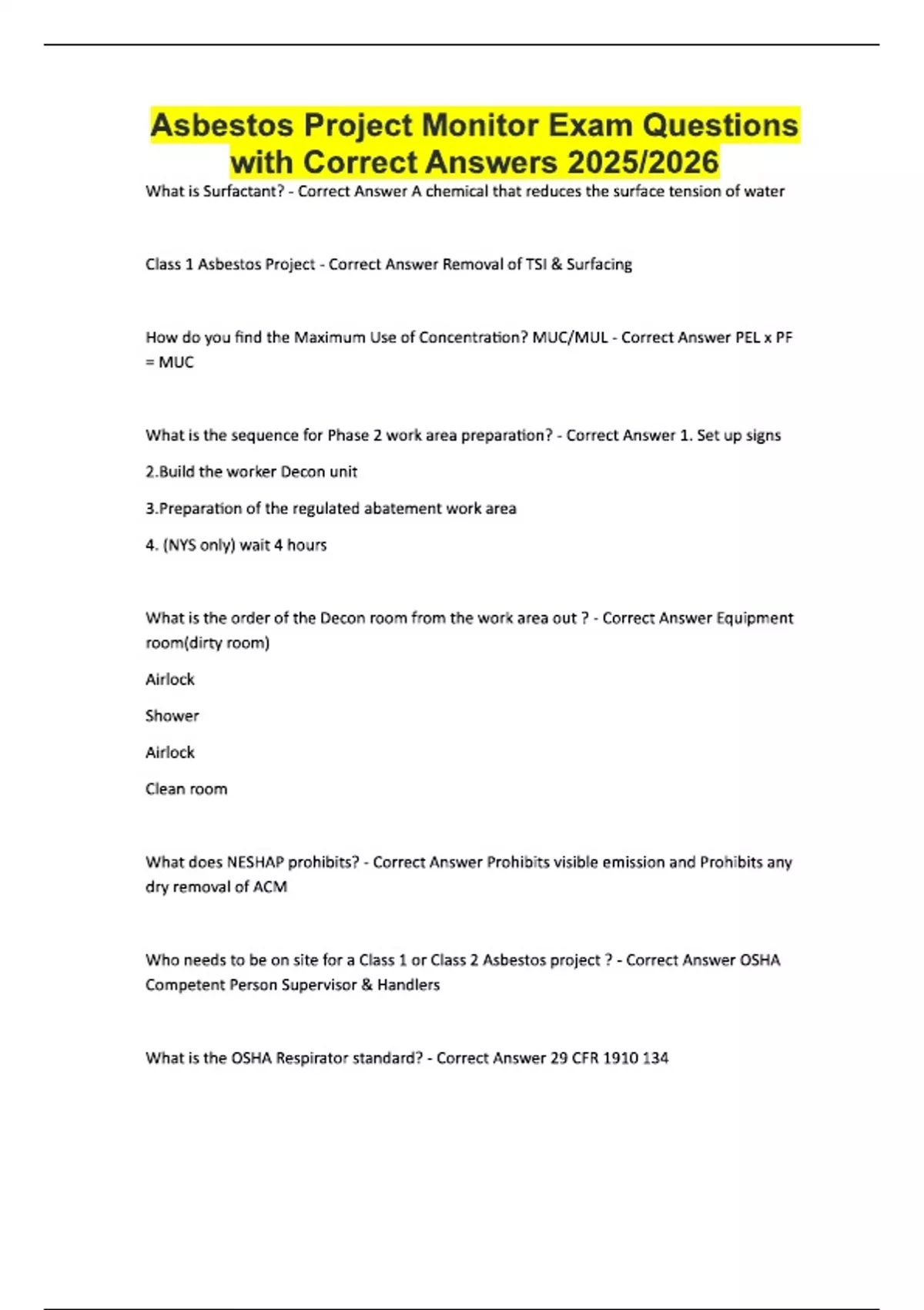 Asbestos Project Monitor Exam Questions with Correct Answers 2025/2026 What is Surfactant? - Correct Answer A chemical that reduces the surface tension of water Class 1 Asbestos Project - Correct Answer Removal of TSI & Surfacing How do you find the Maximum Use of Concentration? MUC/MUL - Correct Answer PEL x PF = MUC What is the sequence for Phase 2 work area preparation? - Correct Answer 1. Set up signs 2.Build the worker Decon unit 3.Preparation of the regulated abatement work area 4. (NYS only) wait 4 hours What is the order of the Decon room from the work area out ? - Correct Answer Equipment room(dirty room) Airlock Shower Airlock Clean room What does NESHAP prohibits? - Correct Answer Prohibits visible emission and Prohibits any dry removal of ACM Who needs to be on site for a Class 1 or Class 2 Asbestos project ? - Correct Answer OSHA Competent Person Supervisor & Handlers What is the OSHA Respirator standard? - Correct Answer 29 CFR 1910 134