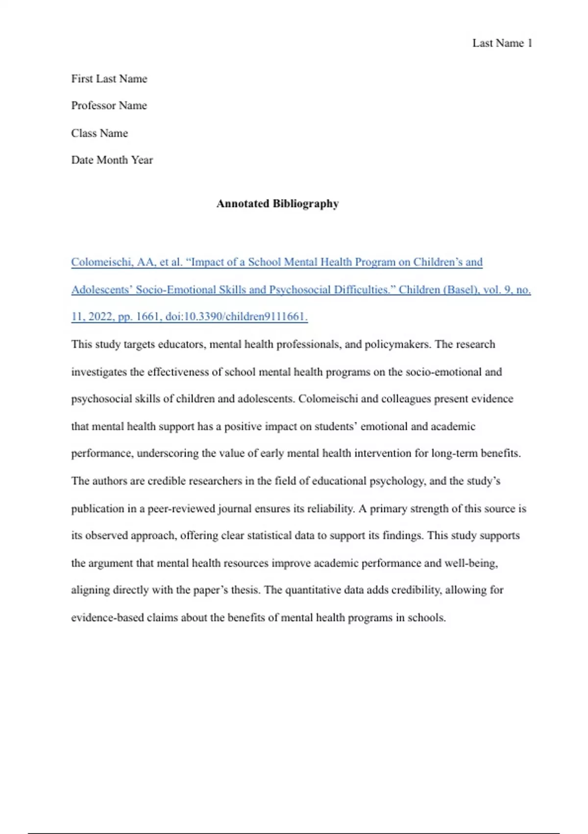 A well-structured annotated bibliography covering seven peer-reviewed sources on school-based mental health programs. Suitable for ENG Composition or similar English composition/research classes. Sources include studies from JAMA, WHO, and RAND Corporation, focusing on SEL, early intervention, and peer-led support.