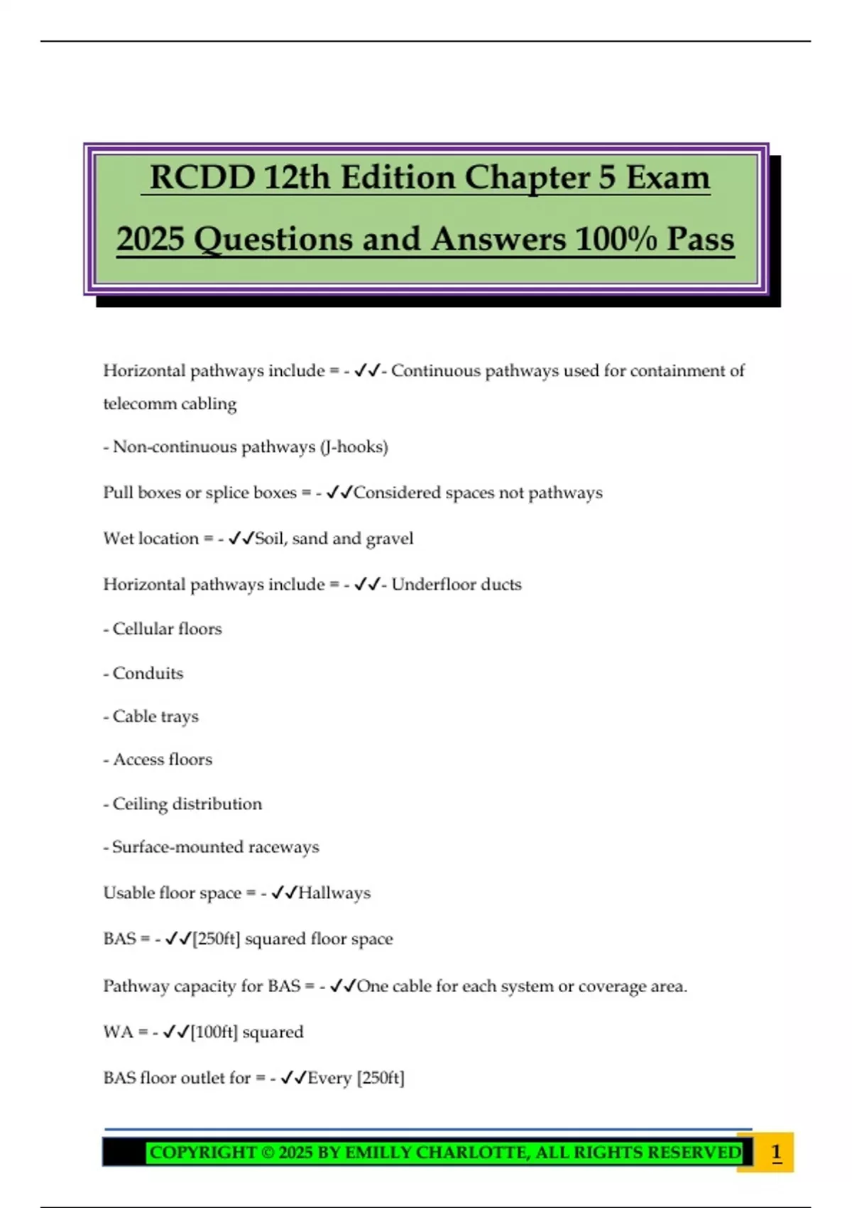 RCDD 12th Edition Chapter 5 Exam 2025 Questions and Answers 100% Pass Horizontal pathways include = - - Continuous pathways used for containment of telecomm cabling - Non-continuous pathways (J-hooks) Pull boxes or splice boxes = - Considered spaces not pathways Wet location = - Soil, sand and gravel Horizontal pathways include = - - Underfloor ducts - Cellular floors - Conduits - Cable trays - Access floors - Ceiling distribution - Surface-mounted raceways Usable floor space = - Hallways BAS = - [250ft] squared floor space Pathway capacity for BAS = - One cable for each system or coverage area. WA = - [100ft] squared BAS floor outlet for = - Every [250ft] 2COPYRIGHT © 2025 BY EMILLY CHARLOTTE, ALL RIGHTS RESERVED Copper 4-pair 100 ohm = - [0.35in] Fiber Optical cable = - [0.18in] During cable pulling, flexible conduit tends to = - - Creep - Shift - Cause sheath damage to the cable If flexible conduit is to be used = - Size should be increased by one trade size relative to the size of a rigid conduit. Flexible conduit = - Not recommended ITS designer should design and install conduits to = - - Achieve the best direct route with no single bend greater than 90 degrees or an aggregate of bends in access of 180 degrees between pull point boxes - Contain no continuous sections sections longer than 30m(100ft) - Bonded and grounded at each end in accordance with national or local code requirements - Withstand the environment to which they will be exposed Conduit runs 30m [100ft] = - Pull points or pull boxes should be inserted that segment between points/boxes exceeds the 30m [100ft] length Conduit should not be run = - - On top of cellular floors cell - Crosswise to cellular floor - Through areas in which flammable material maybe stored Over or adjacent to heat sources such as = - Never place conduit Aluminum or electrical nonmetallic tubing (ENT) thin walle