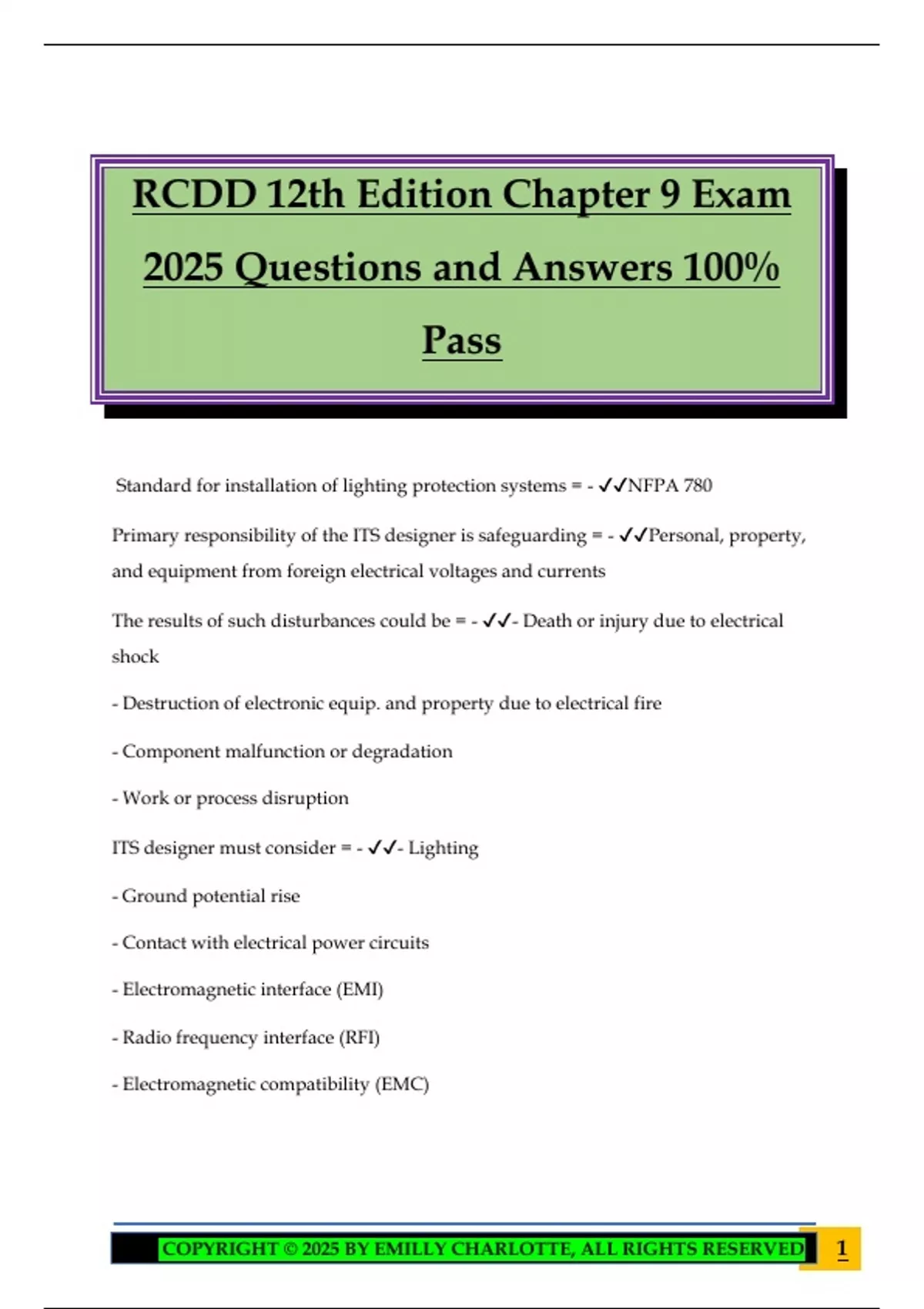 RCDD 12th Edition Chapter 9 Exam 2025 Questions and Answers 100% Pass Standard for installation of lighting protection systems = - NFPA 780 Primary responsibility of the ITS designer is safeguarding = - Personal, property, and equipment from foreign electrical voltages and currents The results of such disturbances could be = - - Death or injury due to electrical shock - Destruction of electronic equip. and property due to electrical fire - Component malfunction or degradation - Work or process disruption ITS designer must consider = - - Lighting - Ground potential rise - Contact with electrical power circuits - Electromagnetic interface (EMI) - Radio frequency interface (RFI) - Electromagnetic compatibility (EMC) 2COPYRIGHT © 2025 BY EMILLY CHARLOTTE, ALL RIGHTS RESERVED ITS designers are not responsible for = - Engineering the portions of the electrical system related to alternating current(AC) electrical ground faults, air terminal lighting protection systems, or transient voltage surge protection Best time to design a grounding protection scheme = - Initial planning and construction Bonding = - Two metallic items ITS designer is typically responsible for = - Telecomm bonding and grounding and the telecommunications circuit protectors The ITS designer must recognize that three separate and distinct grounding systems should be in place at every site = - - AC grounding electrode system - Equipment grounding system - Telecomm bonding infrastructure ITS designer has no authority over = - The AC grounding electrode system The purpose of the AC grounding electrode system(earthing system) is to = - - Establish a zero volt reference for AC electrical power systems, whether utility provided or customer derived - Provide a path for the dissipation of currents due to l