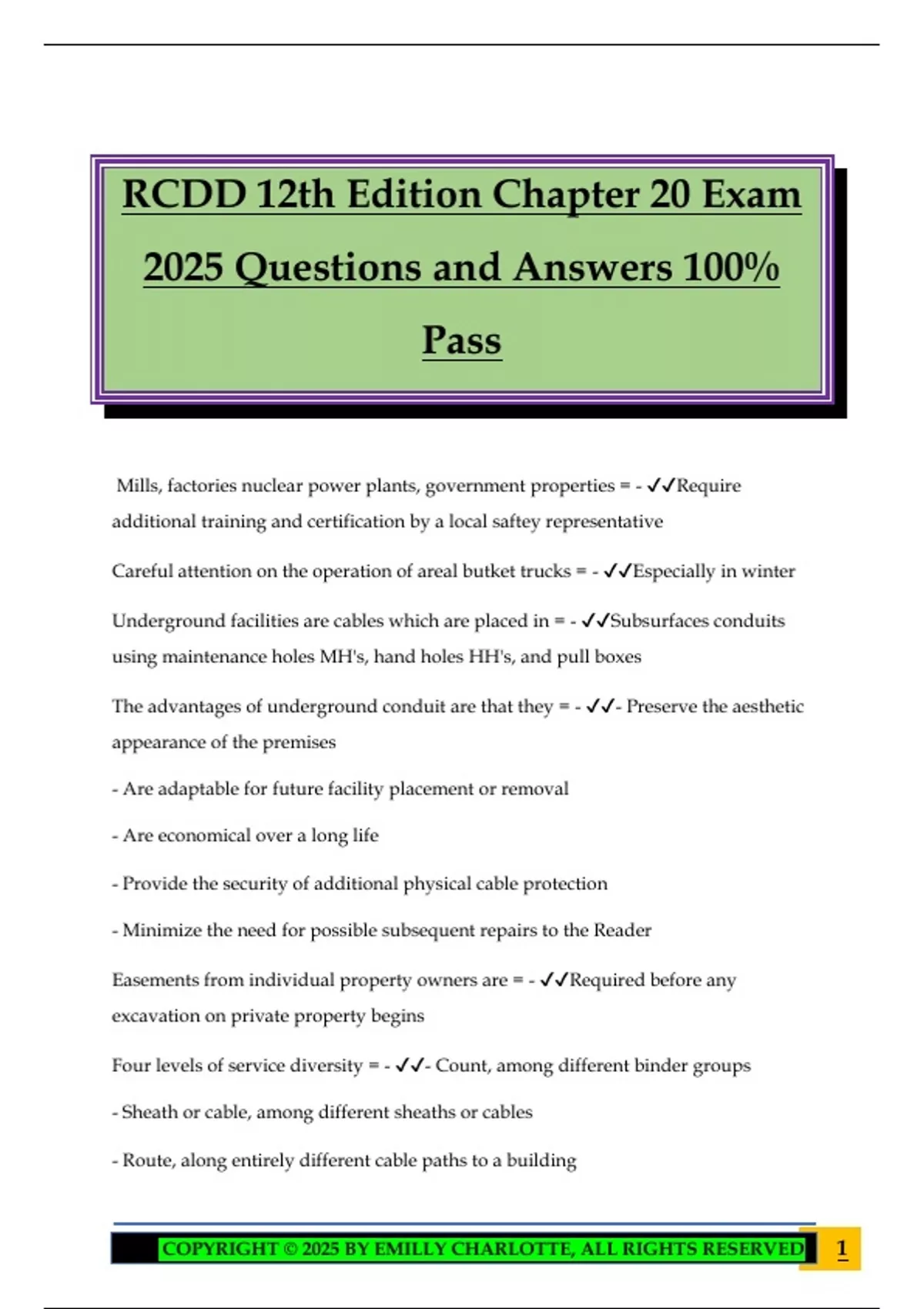 RCDD 12th Edition Chapter 20 Exam 2025 Questions and Answers 100% Pass Mills, factories nuclear power plants, government properties = - Require additional training and certification by a local saftey representative Careful attention on the operation of areal butket trucks = - Especially in winter Underground facilities are cables which are placed in = - Subsurfaces conduits using maintenance holes MH's, hand holes HH's, and pull boxes The advantages of underground conduit are that they = - - Preserve the aesthetic appearance of the premises - Are adaptable for future facility placement or removal - Are economical over a long life - Provide the security of additional physical cable protection - Minimize the need for possible subsequent repairs to the Reader Easements from individual property owners are = - Required before any excavation on private property begins Four levels of service diversity = - - Count, among different binder groups - Sheath or cable, among different sheaths or cables - Route, along entirely different cable paths to a building 2COPYRIGHT © 2025 BY EMILLY CHARLOTTE, ALL RIGHTS RESERVED - Backbone, among different intrabuilding backbone cables The ITS designer should consider installing dual services entrances, two 100 percent diverse routes as emergency for back up for buildings that provide continuous services including = - - Hospitals - Airports - Police and fire stations - Military installations - Radio and television stations - Data centers and telephone central offices If you have 588ft of OSP cable between buildings, what's the length of the cable needed ? - 588 + 49 + 49 BICSI recommends a minimum of four [4 trade size