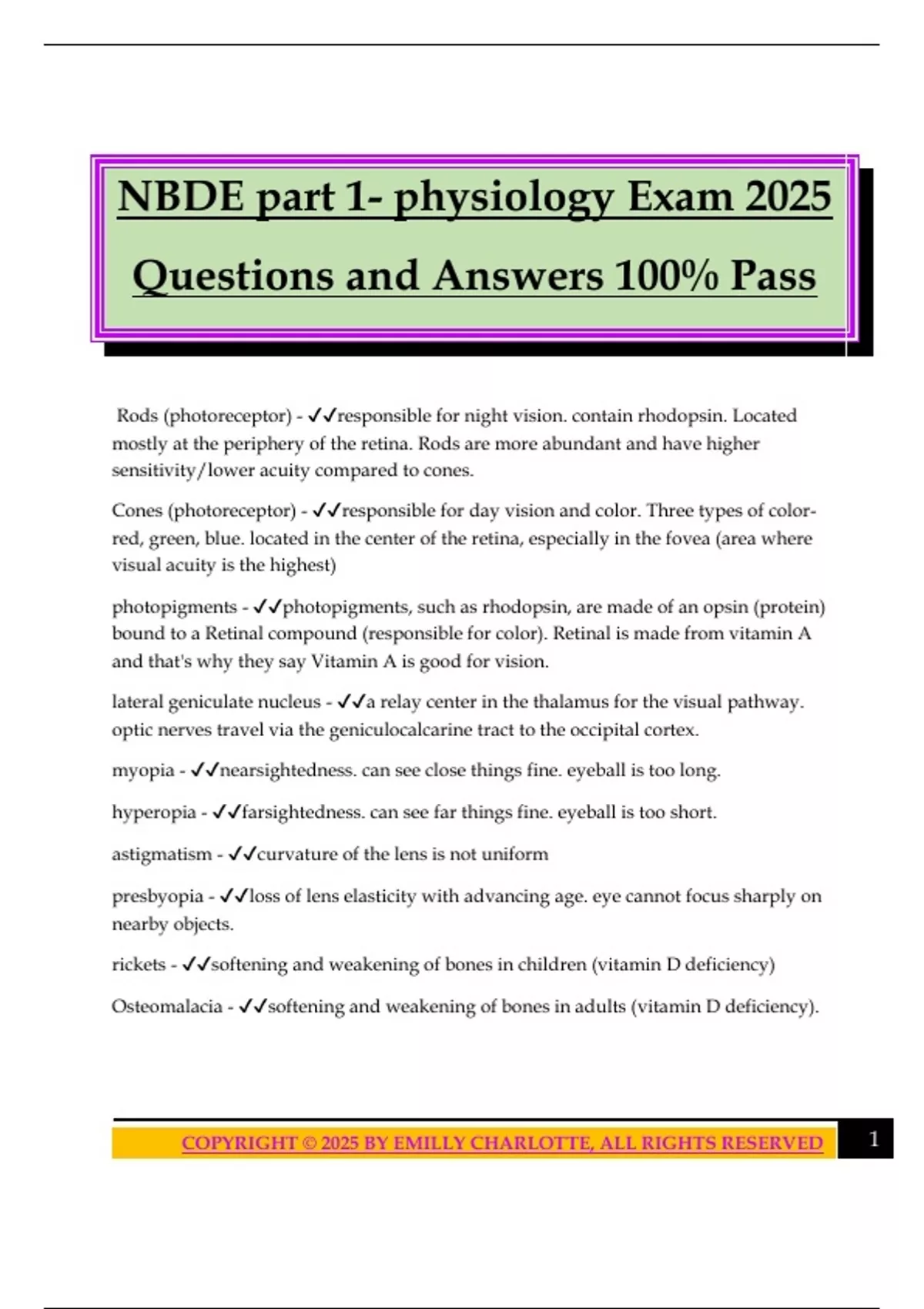 NBDE part 1- physiology Exam 2025 Questions and Answers 100% Pass Rods (photoreceptor) - responsible for night vision. contain rhodopsin. Located mostly at the periphery of the retina. Rods are more abundant and have higher sensitivity/lower acuity compared to cones. Cones (photoreceptor) - responsible for day vision and color. Three types of color- red, green, blue. located in the center of the retina, especially in the fovea (area where visual acuity is the highest) photopigments - photopigments, such as rhodopsin, are made of an opsin (protein) bound to a Retinal compound (responsible for color). Retinal is made from vitamin A and that's why they say Vitamin A is good for vision. lateral geniculate nucleus - a relay center in the thalamus for the visual pathway. optic nerves travel via the geniculocalcarine tract to the occipital cortex. myopia - nearsightedness. can see close things fine. eyeball is too long. hyperopia - farsightedness. can see far things fine. eyeball is too short. astigmatism - curvature of the lens is not uniform presbyopia - loss of lens elasticity with advancing age. eye cannot focus sharply on nearby objects. rickets - softening and weakening of bones in children (vitamin D deficiency) Osteomalacia - softening and weakening of bones in adults (vitamin