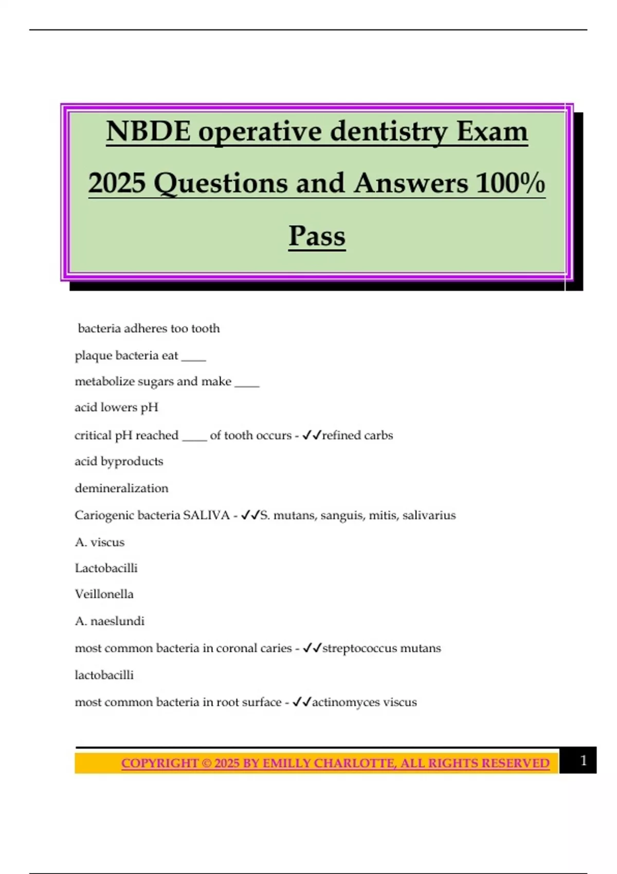 NBDE operative dentistry Exam 2025 Questions and Answers 100% Pass bacteria adheres too tooth plaque bacteria eat ____ metabolize sugars and make ____ acid lowers pH critical pH reached ____ of tooth occurs - refined carbs acid byproducts demineralization Cariogenic bacteria SALIVA - S. mutans, sanguis, mitis, salivarius A. viscus Lactobacilli Veillonella A. naeslundi most common bacteria in coronal caries - streptococcus mutans lactobacilli most common bacteria in root surface - actinomyces viscus 2COPYRIGHT © 2025 BY EMILLY CHARLOTTE, ALL RIGHTS RESERVED earliest found organisms - streptococcus sanguis frank caries - progressed into dentinoenamel junction DEJ bacteria in pit and fissure caries - S. sanguis prevent pit and fissure caries - fissurotomy sealant TF slower progression of smooth surface caries bc less tubues are affected - true how do you prevent smooth surface caries - fluoride zones of incipient lesion - translucnt zone dark zone body zone surface zone translucent zone of incipient lesion - deepest zone composition-less appearance under polarized light dark zone of incipient lesion - remineraliz
