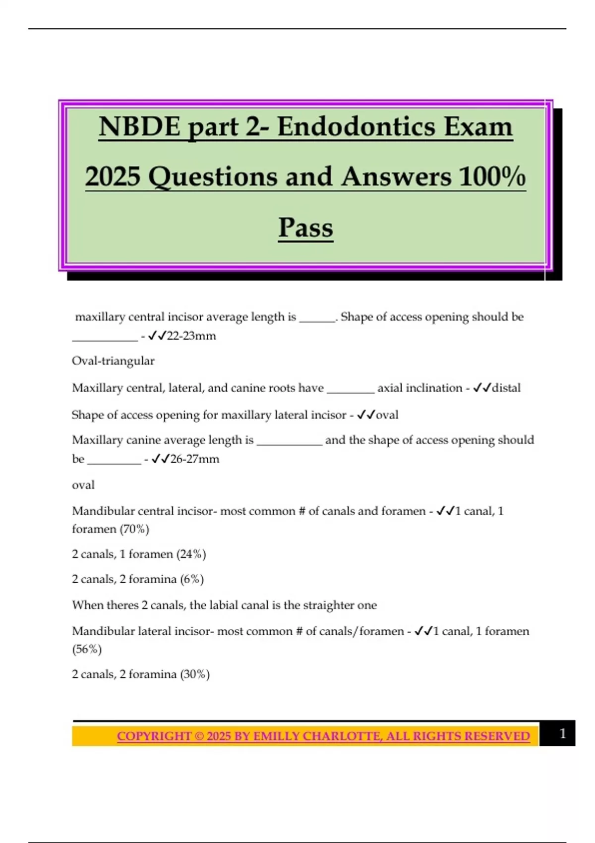 Mandibular lateral incisor- most common # of canals/foramen - ✔✔1 canal, 1 foramen