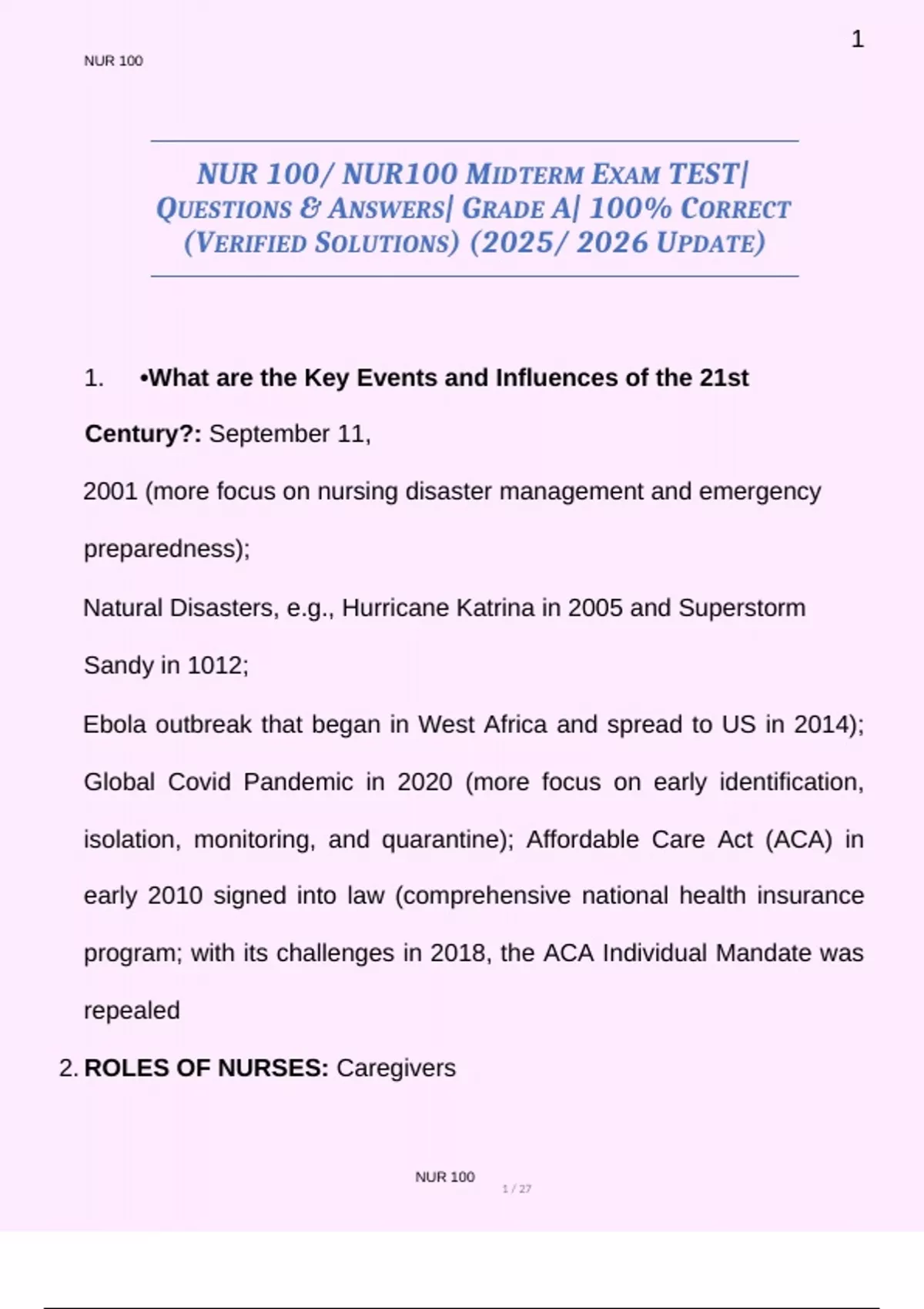 NUR 100/ NUR100 EXAMs 1, 2, 3 plus MIDTERM & FINAL TEST| QUESTIONS & ANSWERS| GRADE A| PACKAGE DEAL