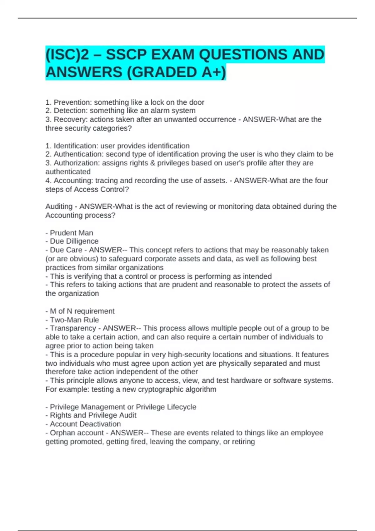 (ISC)2 – SSCP EXAM QUESTIONS AND ANSWERS (GRADED A+)(ISC)2 – SSCP EXAM QUESTIONS AND ANSWERS (GRADED A+)(ISC)2 – SSCP EXAM QUESTIONS AND ANSWERS (GRADED A+) 1. Prevention: something like a lock on the door 2. Detection: something like an alarm system 3. Recovery: actions taken after an unwanted occurrence - ANSWER-What are the three security categories? 1. Identification: user provides identification 2. Authentication: second type of identification proving the user is who they claim to be 3. Authorization: assigns rights & privileges based on user's profile after they are authenticated 4. Accounting: tracing and recording the use of assets. - ANSWER-What are the four steps of Access Control? Auditing - ANSWER-What is the act of reviewing or monitoring data obtained during the Accounting process?