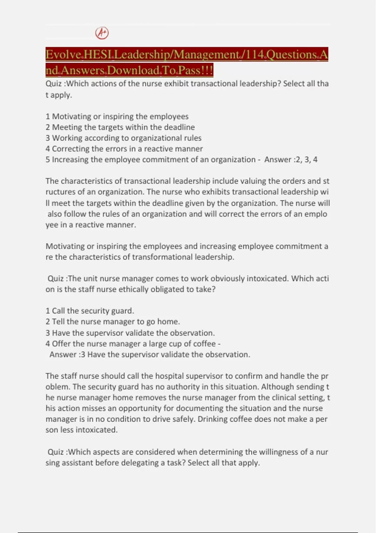 Quiz :Which actions of the nurse exhibit transactional leadership? Select all tha
