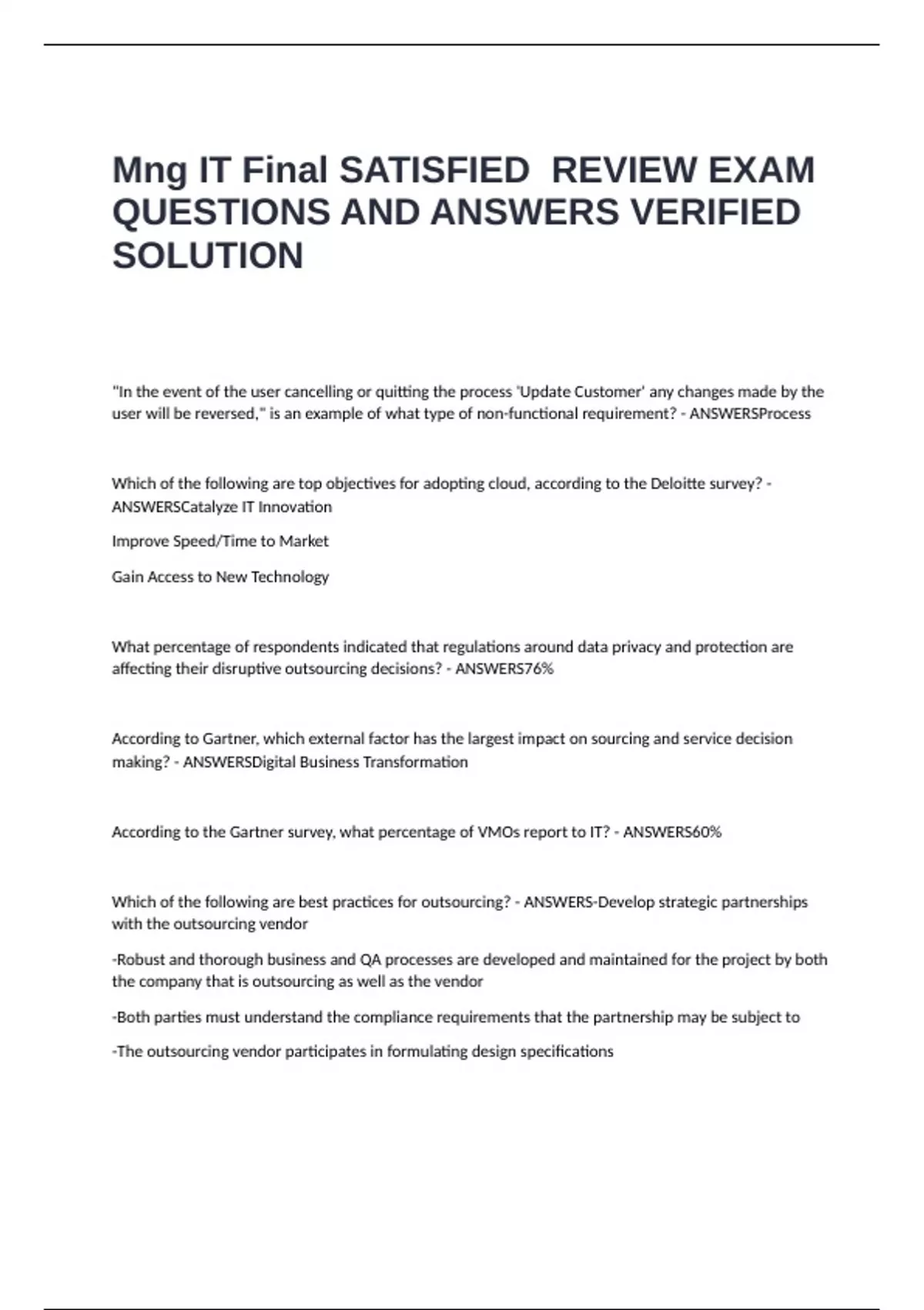 Mng IT Final SATISFIED REVIEW EXAM QUESTIONS AND ANSWERS VERIFIED SOLUTION