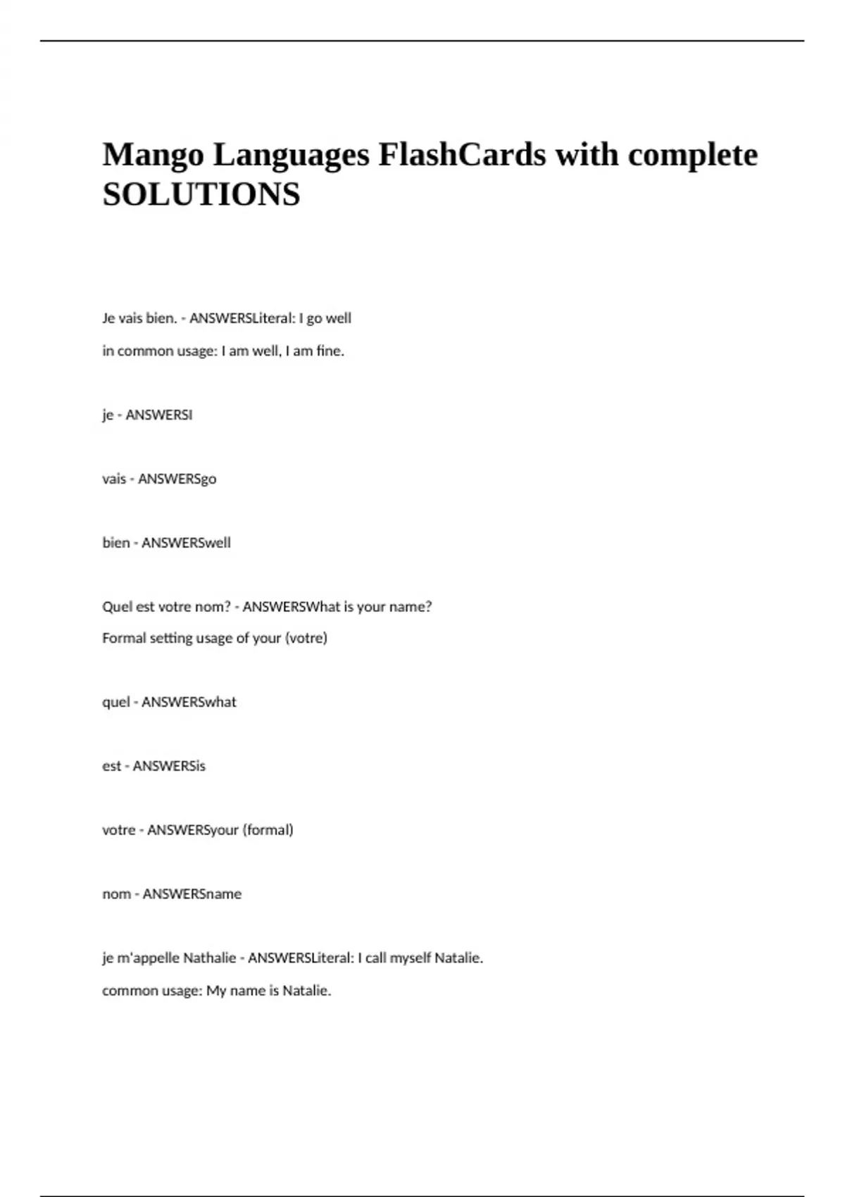 Mango Languages FlashCards with complete SOLUTIONS Je vais bien. - ANSWERSLiteral: I go well in common usage: I am well, I am fine. je - ANSWERSI vais - ANSWERSgo bien - ANSWERSwell Quel est votre nom? - ANSWERSWhat is your name? Formal setting us
