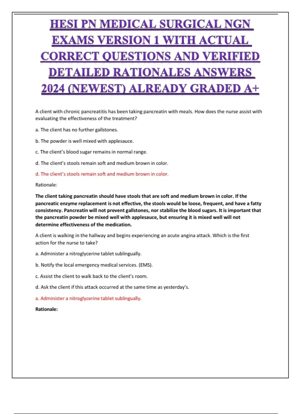 HESI PN MEDICAL SURGICAL NGN EXAMS VERSION 1 WITH ACTUAL CORRECT QUESTIONS AND VERIFIED DETAILED RATIONALES ANSWERS 2024 (NEWEST) ALREADY GRADED A+ A client with chronic pancreatitis has been taking pancreatin with meals. How does the nurse assist with evaluating the effectiveness of the treatment? a. The client has no further gallstones. b. The powder is well mixed with applesauce. c. The client’s blood sugar remains in normal range. d. The client’s stools remain soft and medium brown in color. d. The client’s stools remain soft and medium brown in color. Rationale: The client taking pancreatin should have stools that are soft and medium brown in color. If the pancreatic enzyme replacement is not effective, the stools would be loose, frequent, and have a fatty consistency. Pancreatin will not prevent gallstones, nor stabilize the blood sugars. It is important that the pancreatin powder be mixed well with applesauce, but ensuring it is mixed well will not determine effectiveness of the medication. A client is walking in the hallway and begins experiencing an acute angina attack. Which is the first action for the nurse to take? a. Administer a nitroglycerine tablet sublingually. b. Notify the local emergency medical services. (EMS). c. Assist the client to walk back to the client’s room. d. Ask the client if this attack occurred at the same time as yesterday’s. a. Administer a nitroglycerine tablet sublingually. Rationale: