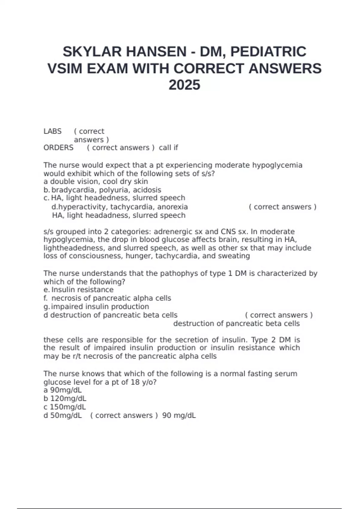 SKYLAR HANSEN - DM, PEDIATRIC VSIM EXAM WITH CORRECT ANSWERS 2025
