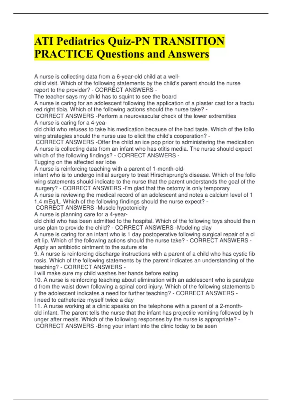 ATI Pediatrics Quiz-PN TRANSITION