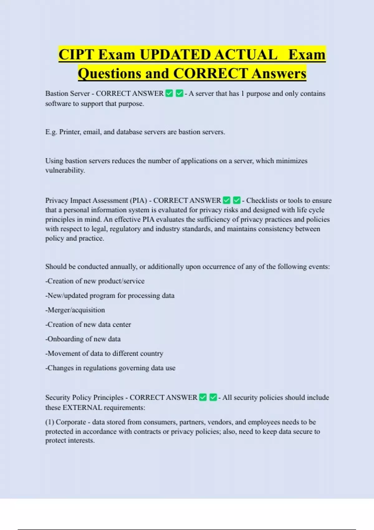 CIPT Exam UPDATED ACTUAL Exam Questions and CORRECT Answers Bastion Server - CORRECT ANSWER software to support that purpose. - A server that has 1 purpose and only contains E.g. Printer, email, and database servers are bastion servers. Using bastion servers reduces the number of applications on a server, which minimizes vulnerability. Privacy Impact Assessment (PIA) - CORRECT ANSWER - Checklists or tools to ensure that a personal information system is evaluated for privacy risks and designed with life cycle principles in mind. An effective PIA evaluates the sufficiency of privacy practices and policies with respect to legal, regulatory and industry standards, and maintains consistency between