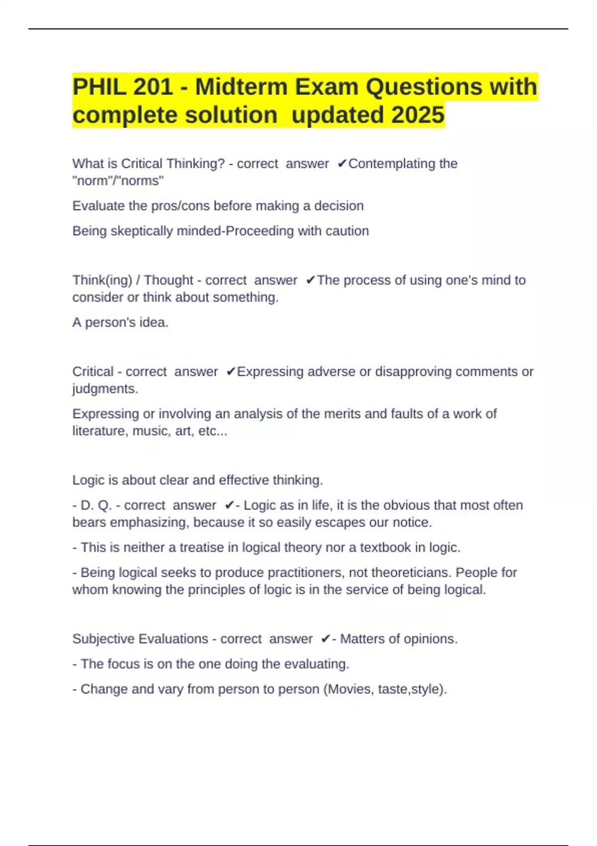 PHIL 201 Liberty University - PHIL 201 - Midterm Exam Questions with complete solution updated 2025 What is Critical Thinking? - correct answer Contemplating the "norm"/"norms" Evaluate the pros/cons before making a decision Being skeptically minded-Proceeding with caution Think(ing) / Thought - correct answer The process of using one's mind to consider or think about something. A person's idea. Critical - correct answer Expressing adverse or disapproving comments or judgments. Expressing or involving an analysis of the merits and faults of a work of literature, music, art, etc... Logic is about clear and effective thinking. - D. Q. - correct answer - Logic as in life, it is the obvious that most often bears emphasizing, because it so easily escapes our notice. - This is neither a treatise in logical theory nor a textbook in logic. - Being logical seeks to produce practitioners, not theoreticians. People for whom knowing the principles of logic is in the service of being logical. Subjective Evaluations - correct answer - Matters of opinions. - The focus is on the one doing the evaluating. - Change and vary from person to person (Movies, taste,style).
