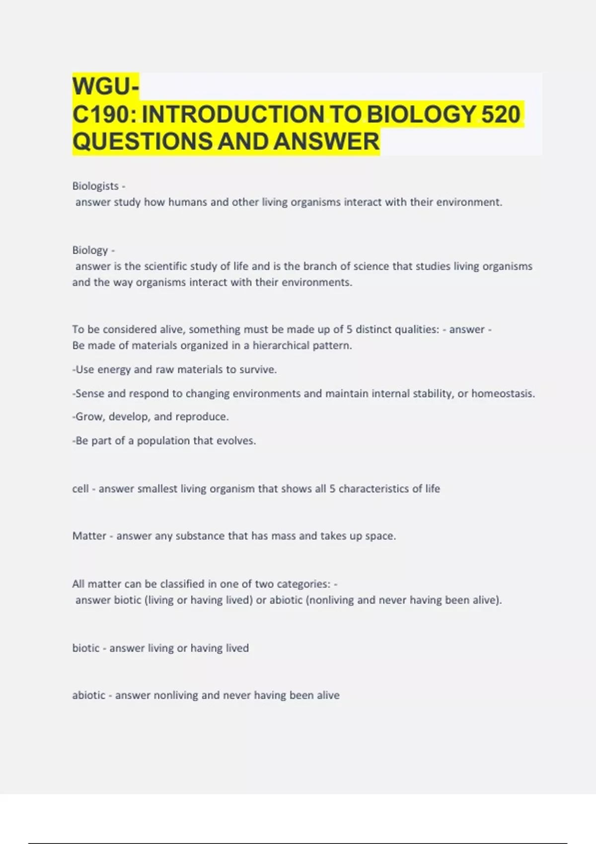 WGU C190 INTRO TO BIOLOGY LATEST UPDATED VERSION ACTUAL EXAM 150 COMPLETE REAL QUESTIONS AND CORRECT ANSWERS (CORRECT VERIFIED SOLUTIONS) GUARANTEED PASS.