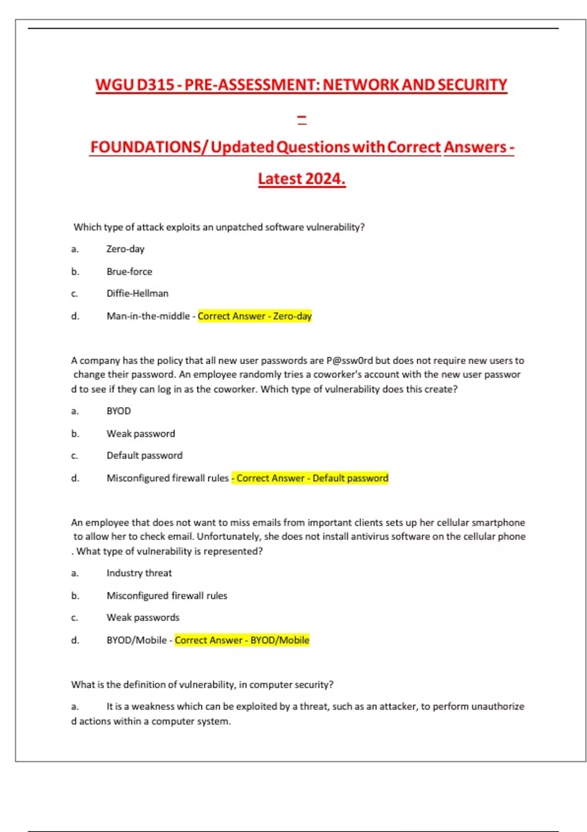 WGU D315 - PRE-ASSESSMENT: NETWORK AND SECURITY