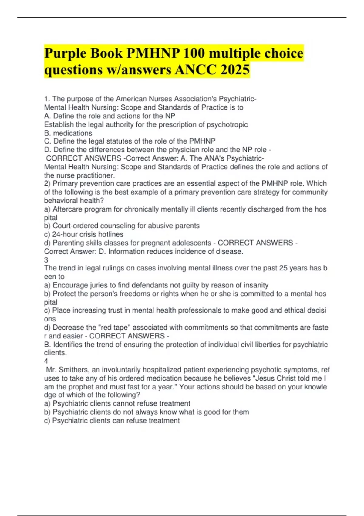 Purple Book PMHNP 100 multiple choice questions w/answers ANCC 2025