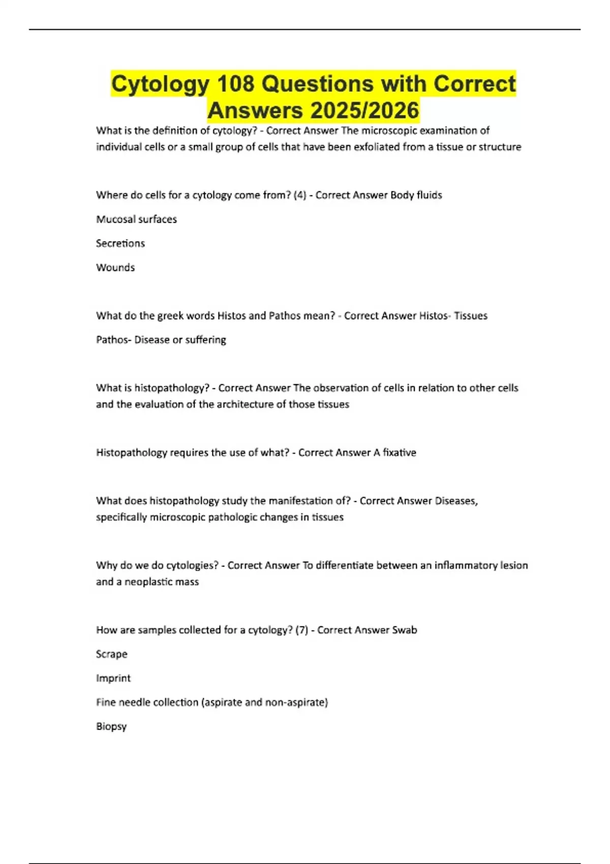 Cytology 108 Questions with Correct Answers 2025/2026 What is the definition of cytology? - Correct Answer The microscopic examination of individual cells or a small group of cells that have been exfoliated from a tissue or structure Where do cells for a cytology come from? (4) - Correct Answer Body fluids Mucosal surfaces Secretions Wounds What do the greek words Histos and Pathos mean? - Correct Answer Histos- Tissues Pathos- Disease or suffering What is histopathology? - Correct Answer The observation of cells in relation to other cells and the evaluation of the architecture of those tissues Histopathology requires the use of what? - Correct Answer A fixative What does histopathology study the manifestation of? - Correct Answer Diseases, specifically microscopic pathologic changes in tissues Why do we do cytologies? - Correct Answer To differentiate between an inflammatory lesion and a neoplastic mass How are samples collected for a cytology? (7) - Correct Answer Swab Scrape Imprint Fine needle collection (aspirate and non-aspirate) Biopsy