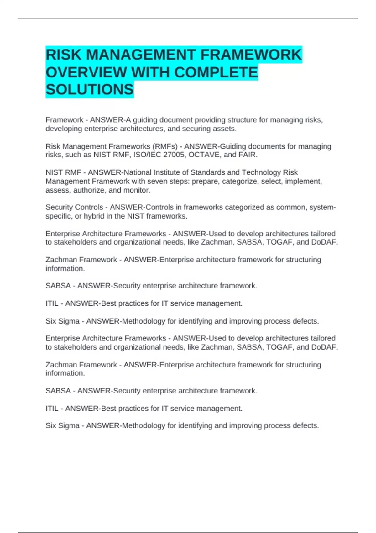 RISK MANAGEMENT FRAMEWORK OVERVIEW WITH COMPLETE SOLUTIONSRISK MANAGEMENT FRAMEWORK OVERVIEW WITH COMPLETE SOLUTIONS Framework - ANSWER-A guiding document providing structure for managing risks, developing enterprise architectures, and securing assets. Risk Management Frameworks (RMFs) - ANSWER-Guiding documents for managing risks, such as NIST RMF, ISO/IEC 27005, OCTAVE, and FAIR. NIST RMF - ANSWER-National Institute of Standards and Technology Risk Management Framework with seven steps: prepare, categorize, select, implement,