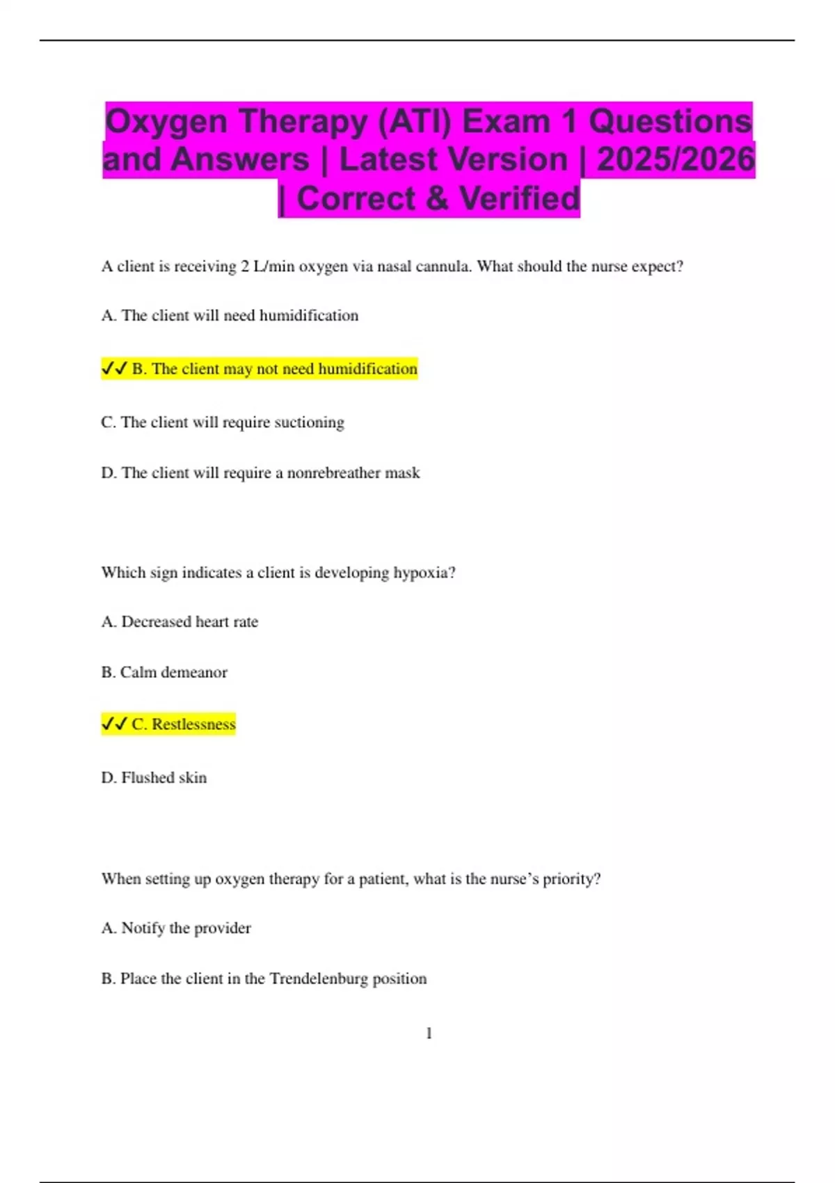 Oxygen Therapy (ATI) Exam 1 Questions and Answers | Latest Version | 2025/2026 | Correct & Verified A client is receiving 2 L/min oxygen via nasal cannula. What should the nurse expect? A. The client will need humidification B. The client may not need humidification C. The client will require suctioning D. The client will require a nonrebreather mask Which sign indicates a client is developing hypoxia? A. Decreased heart rate B. Calm demeanor C. Restlessness D. Flushed skin When setting up oxygen therapy for a patient, what is the nurse’s priority? A. Notify the provider B. Place the client in the Trendelenburg position 2 C. Ensure proper oxygen delivery and flow rate D. Insert an IV line Which oxygen delivery device delivers the highest concentration of oxygen? A. Nasal cannula B. Nonrebreather mask C. Venturi mask D. Simple face mask What is a potential hazard of using oxygen therapy? A. Fire risk B. Dehydration C. Seizures D. Hypoglycemia A client with COPD requires oxygen therapy. What device is most appropriate? A. Venturi mask B. Simple face mask 3 C. Nonrebreather mask D. Nasopharyngeal airway Which symptom indicates late-stage hypoxia? A. Anxiety B. Cyanosis C. Irritability D. Tachycardia What is the correct action when a nasal cannula becomes dislodged? A. Reapply it properly B. Increase the flow rate C. Discontinue oxygen D. Switch to a face mask Which oxygen delivery device provides 24%-44% oxygen concentration? A. Nasal cannula B. Partial rebreather mask 4 C. Nonrebreather mask D. Venturi mask A nurse finds a client’s oxygen tubing kinked. What should she do first? A. Straighten the tubing B. Notify respiratory therapy C. Switch to a face mask D. Increase the oxygen flow When should oxygen humidification definitely be used? A. With any oxygen therapy B. When flow rate exceeds 4 L/min C. Only with mechanical ventilation D. When patient requests it What should a nurse teach a client about home oxygen therapy? A. Keep oxygen away from open flames B. Store oxygen cylinders