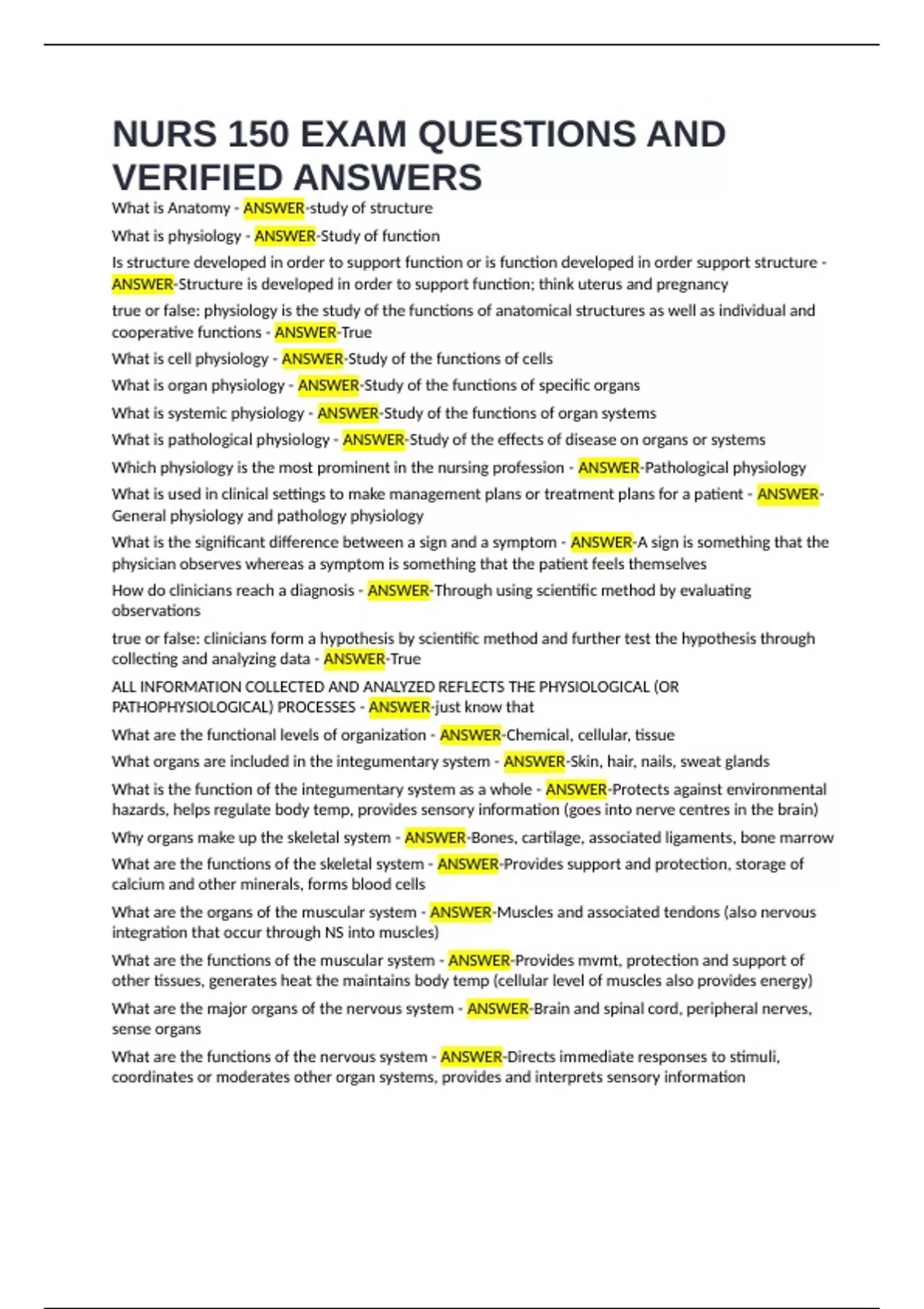 NURS 150 EXAM QUESTIONS AND VERIFIED ANSWERS