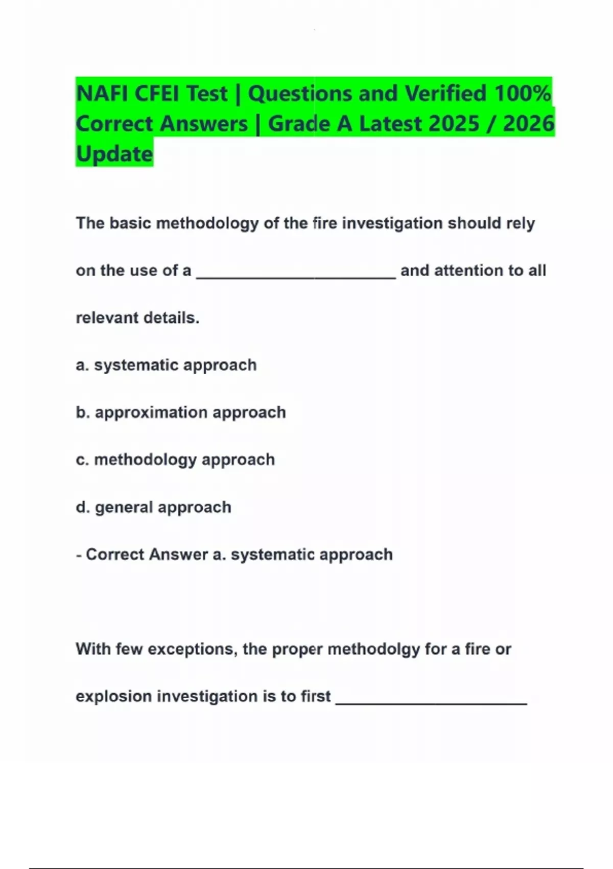NAFI CFEI Test | Questions and Verified 100% Correct Answers | Grade A Latest 2025 / 2026 Update The basic methodology of the fire investigation should rely on the use of a ______________________ and attention to all relevant details. a. systematic approach b. approximation approach c. methodology approach d. general approach - Correct Answer a. systematic approach With few exceptions, the proper methodolgy for a fire or explosion investigation is to first _____________________ then investigate the cause, circumstances, conditions, or agencies that brought the ignition source