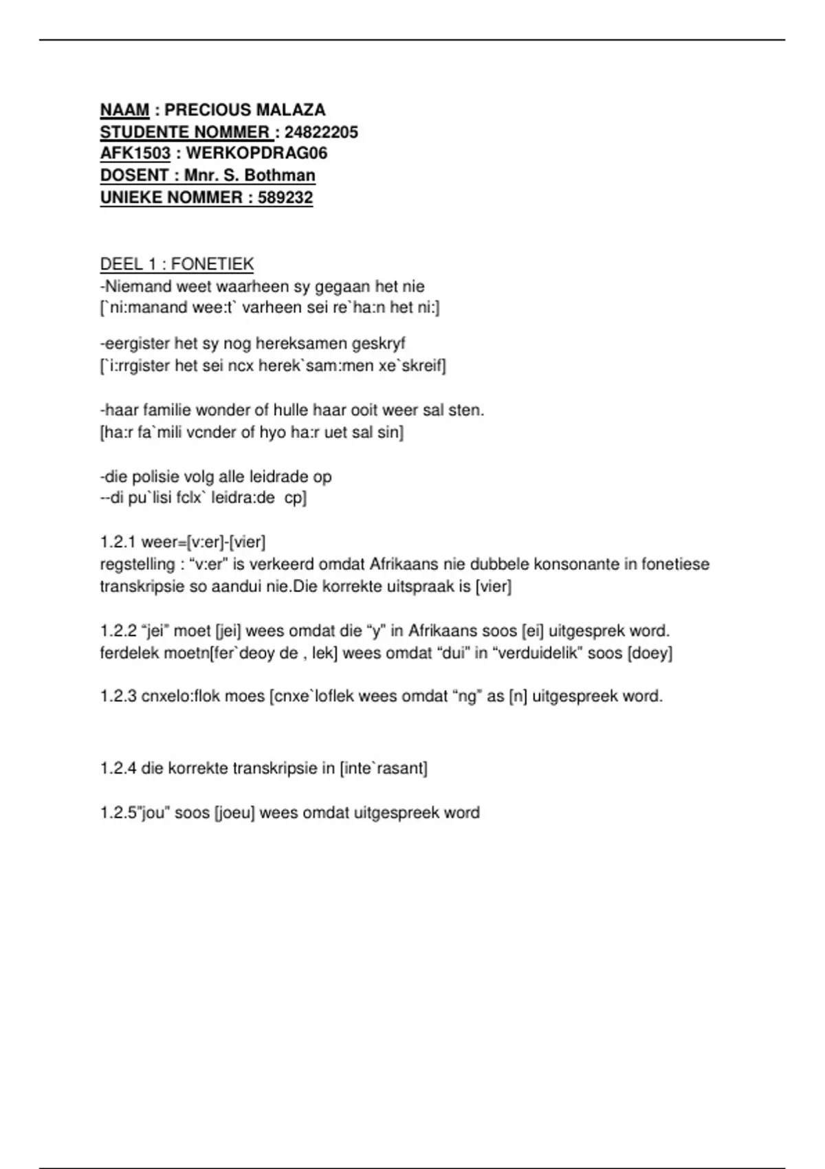 1.2.2 “jei” moet [jei] wees omdat die “y” in Afrikaans soos [ei] uitgesprek word.