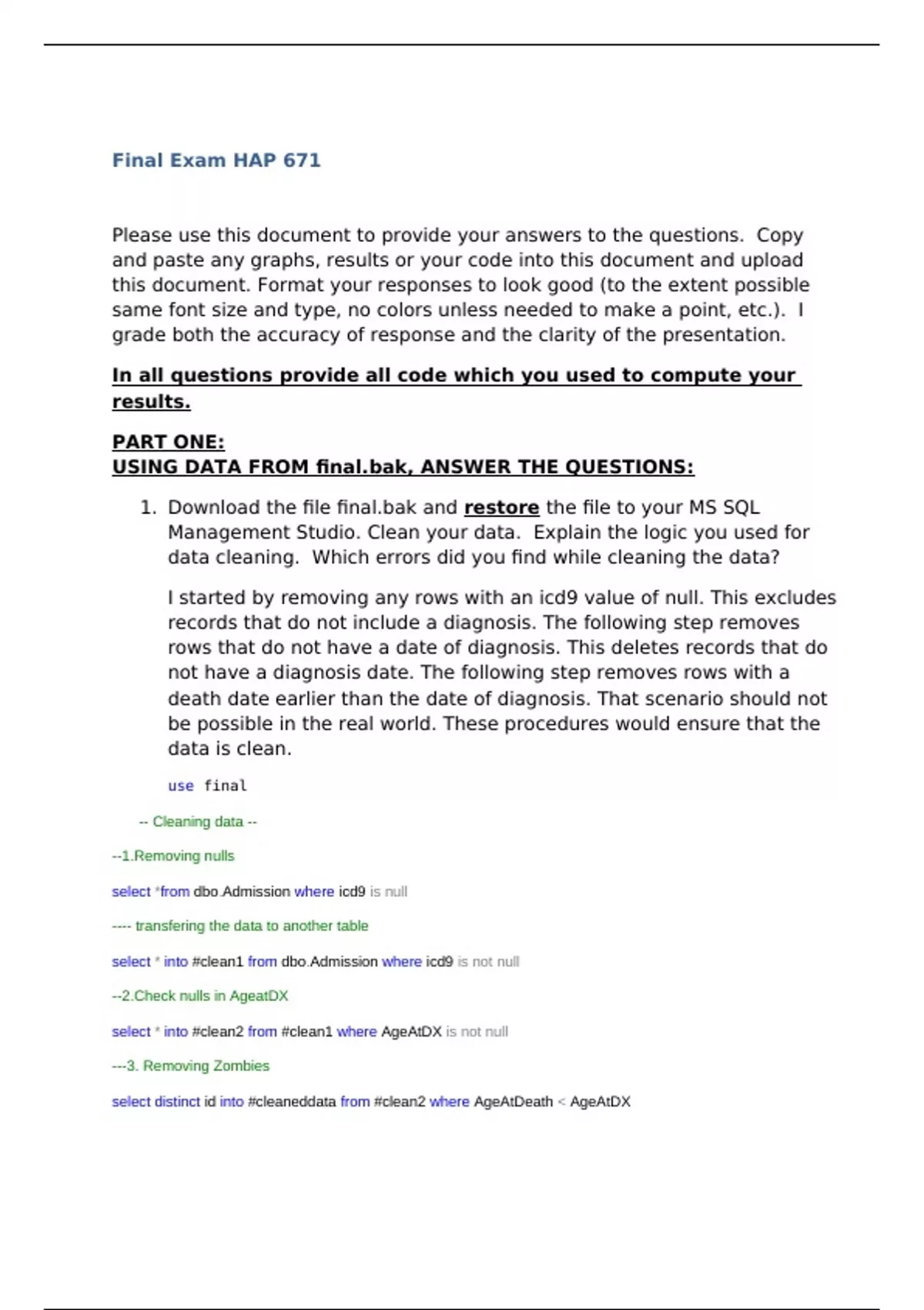 Complete sample answers for HAP 671 Final Exam covering data cleaning, indexing, SQL queries, statistical analysis, and case-control study setup. Includes step-by-step SQL code and detailed explanations. Perfect for exam practice and mastering concepts.