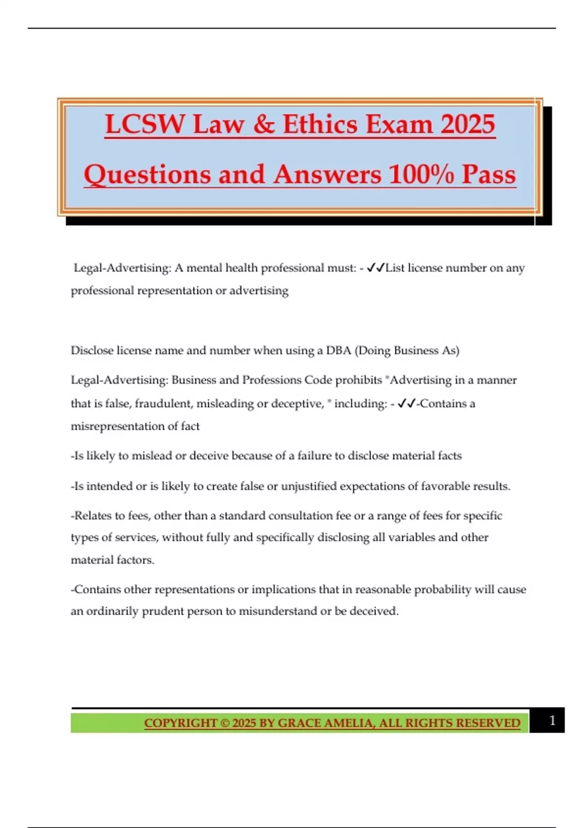 LCSW Law & Ethics Exam 2025 Questions and Answers 100% Pass Legal-Advertising: A mental health professional must: - List license number on any professional representation or advertising Disclose license name and number when using a DBA (Doing Business As) Legal-Advertising: Business and Professions Code prohibits "Advertising in a manner that is false, fraudulent, misleading or deceptive, " including: - -Contains a misrepresentation of fact -Is likely to mislead or deceive because of a failure to disclose material facts -Is intended or is likely to create false or unjustified expectations of favorable results. -Relates to fees, other than a standard consultation fee or a range of fees for specific types of services, without fully and specifically disclosing all variables and other material factors. -Contains other representations or implications that in reasonable probability will cause an ordinarily prudent person to misunderstand or be deceived. 2COPYRIGHT © 2025 BY GRACE AMELIA, ALL RIGHTS RESERVED -Makes a claim either of professional superiority or of performing services in a superior manner, unless that claim is relevant to the service being performed and can be substantiated with objective scientific evidence. -Makes a scientific claim that can not be substantiated by reliable, peer reviewed, published scientific studies. -Includes any statement, endorsement, or testimonial that is likely to mislead or deceive. Ethical-Advertising: - -Accurately represent competence -Correct any false, misleading, or inaccurate information about them -Do not solicit testimonials from patients. -Only claim "specializing" or having "expertise" if they have the background that meets professional standards to practice as expert Child Abuse-When therapists have reasonable suspicion of child abuse or neglect they are mandated to file a report by: - calling California state authorities immediately and filing a written report within 36 hours. Child Abuse-Mandated reports are - physical abuse, sexual abuse, neglect Child Abuse-Optional reports are - emotional abuse, exposure to domestic violence Child Abuse-True or False? Abuse/neglect that occurred outside the state of California are still reported to California state authorities. - True Child Abuse-True or False? If the client is 18 or older and reports abuse occurred when s/he was a minor, the therapist would maintain confidentiality - True, unless there was reasonable suspicion that the perpetrator was abusing other minors.