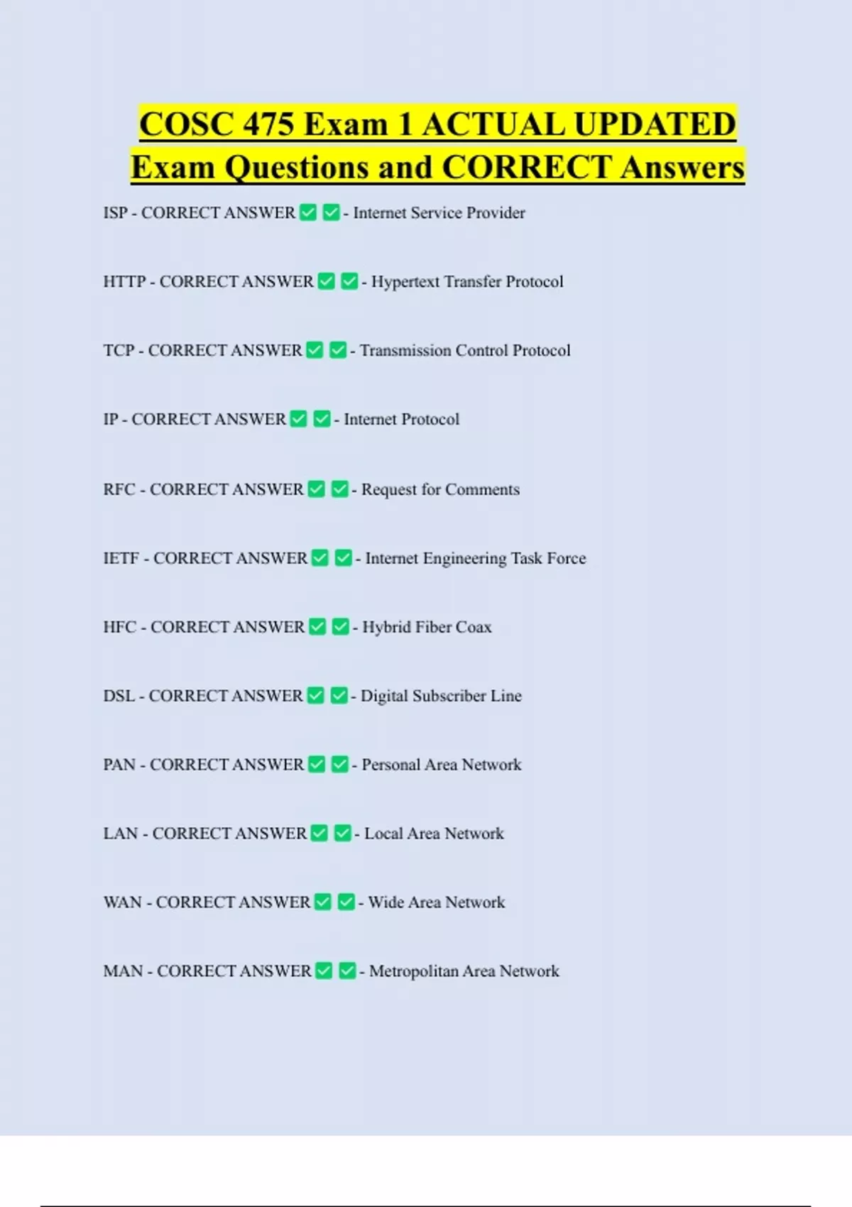 COSC 475 Exam 1 ACTUAL UPDATED Exam Questions and CORRECT Answers ISP - CORRECT ANSWER HTTP - CORRECT ANSWER TCP - CORRECT ANSWER IP - CORRECT ANSWER RFC - CORRECT ANSWER IETF - CORRECT ANSWER HFC - CORRECT ANSWER DSL - CORRECT ANSWER PAN - CORRECT ANSWER LAN - CORRECT ANSWER WAN - CORRECT ANSWER MAN - CORRECT ANSWER - Internet Service Provider - Hypertext Transfer Protocol - Transmission Control Protocol - Internet Protoc