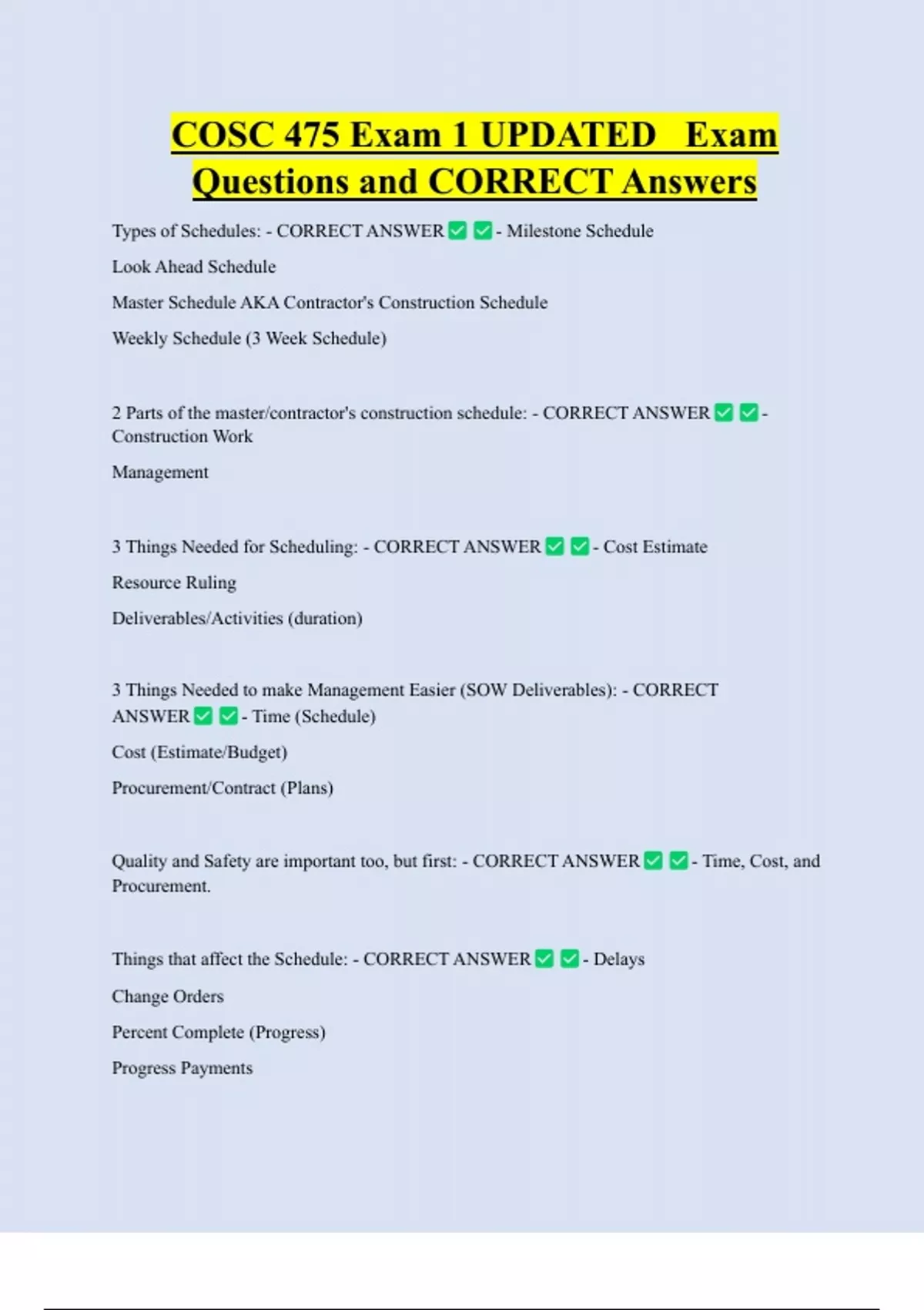 COSC 475 Exam 1 UPDATED Exam Questions and CORRECT Answers Types of Schedules: - CORRECT ANSWER Look Ahead Schedule - Milestone Schedule Master Schedule AKA Contractor's Construction Schedule Weekly Schedule (3 Week Schedule) 2 Parts of the master/contractor's construction schedule: - CORRECT ANSWER Construction Work Management 3 Things Needed for Scheduling: - CORRECT ANSWER Resource Ruling Deliverables/Activities (duration) - Cost Estimate