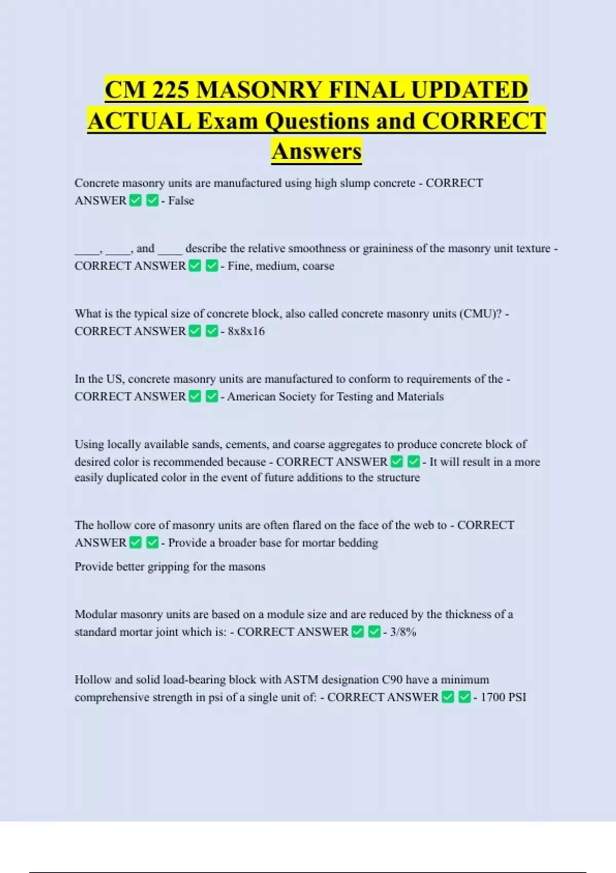 CM 225 MASONRY FINAL UPDATED ACTUAL Exam Questions and CORRECT Answers