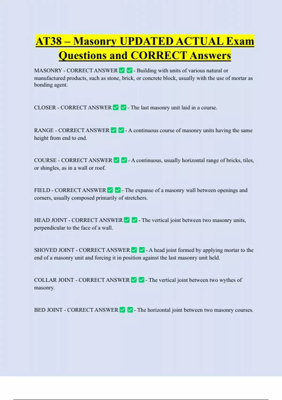 AT38 – Masonry UPDATED ACTUAL Exam Questions and CORRECT Answers MASONRY - CORRECT ANSWER - Building with units of various natural or manufactured products, such as stone, brick, or concrete block, usually with the use of mortar as bonding agent. CLOSER - CORRECT ANSWER RANGE - CORRECT ANSWER height from end to end. COURSE - CORRECT ANSWER or shingles, as in a wall or roof. FIELD - CORRECT ANSWER - The last masonry unit laid in a course. - A continuous course of masonry units having the same - A continuous, usually horizontal range of bricks, tiles