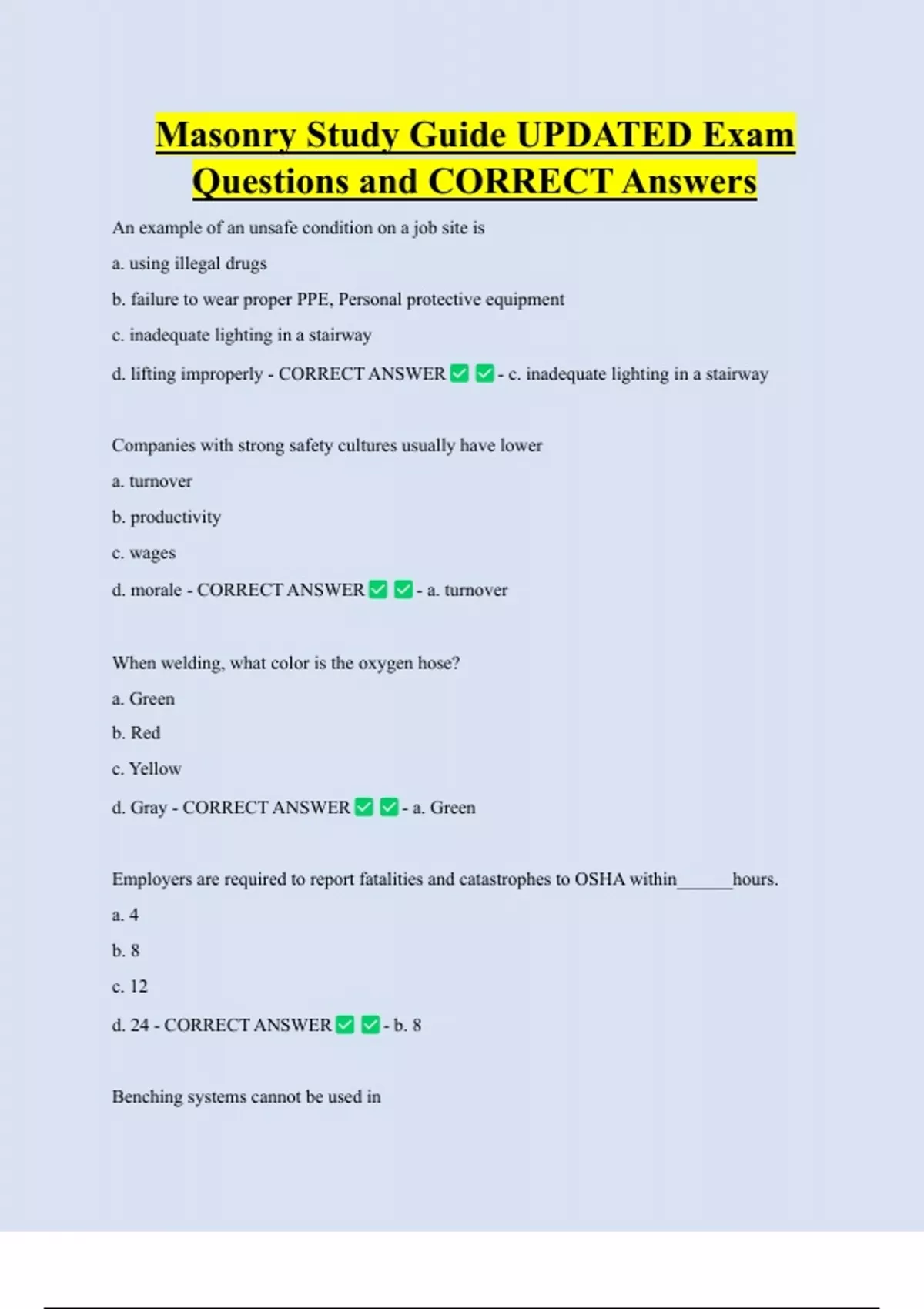 Masonry Study Guide UPDATED Exam Questions and CORRECT Answers An example of an unsafe condition on a job site is a. using illegal drugs b. failure to wear proper PPE, Personal protective equipment c. inadequate lighting in a stairway d. lifting improperly - CORRECT ANSWER - c. inadequate lighting in a stairway