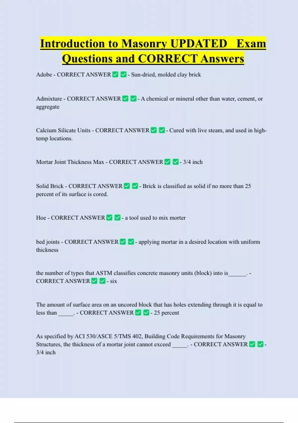 Introduction to Masonry UPDATED Exam Questions and CORRECT Answers Adobe - CORRECT ANSWER Admixture - CORRECT ANSWER aggregate - Sun-dried, molded clay brick - A chemical or mineral other than water, cement, or Calcium Silicate Units - CORRECT ANSWER temp locations. Mortar Joint Thickness Max - CORRECT ANSWER Solid Brick - CORRECT ANSWER - Cured with live steam, and used in high-- 3/4 inch