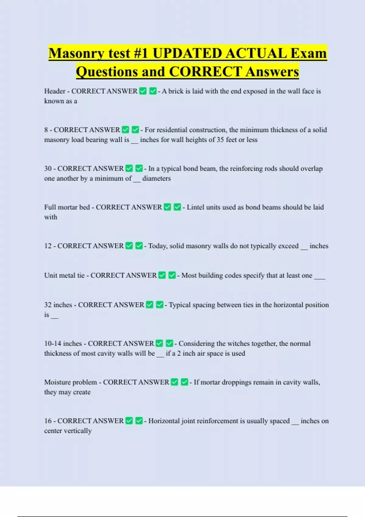Masonry test #1 UPDATED ACTUAL Exam Questions and CORRECT Answers Header - CORRECT ANSWER known as a 8 - CORRECT ANSWER - A brick is laid with the end exposed in the wall face is - For residential construction, the minimum thickness of a solid masonry load bearing wall is __ inches for wall heights of 35 feet or less 30 - CORRECT ANSWER - In a typical bond beam, the reinforcing rods should overlap one another by a minimum of __ diameters