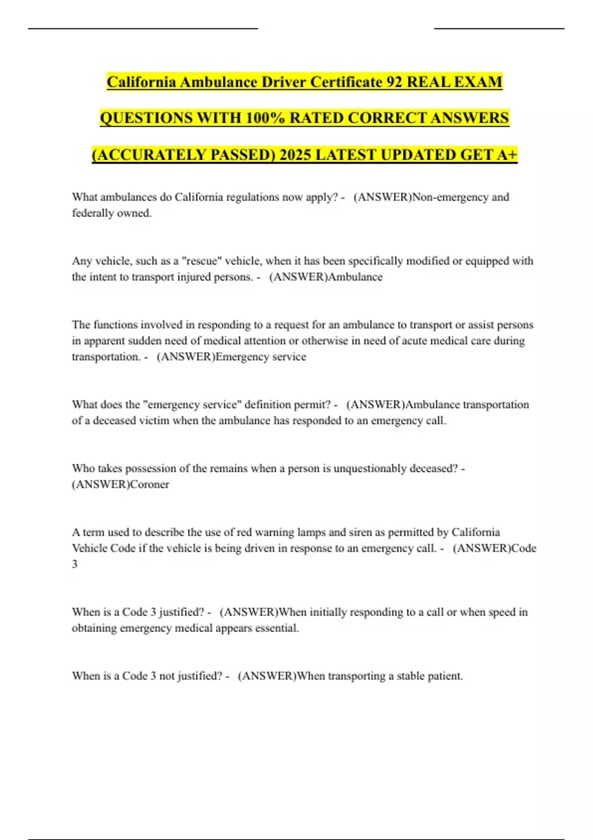 California Ambulance Driver Certificate 92 REAL EXAM