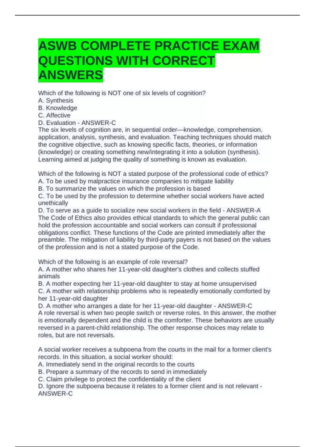 ASWB COMPLETE PRACTICE EXAM QUESTIONS WITH CORRECT ANSWERS