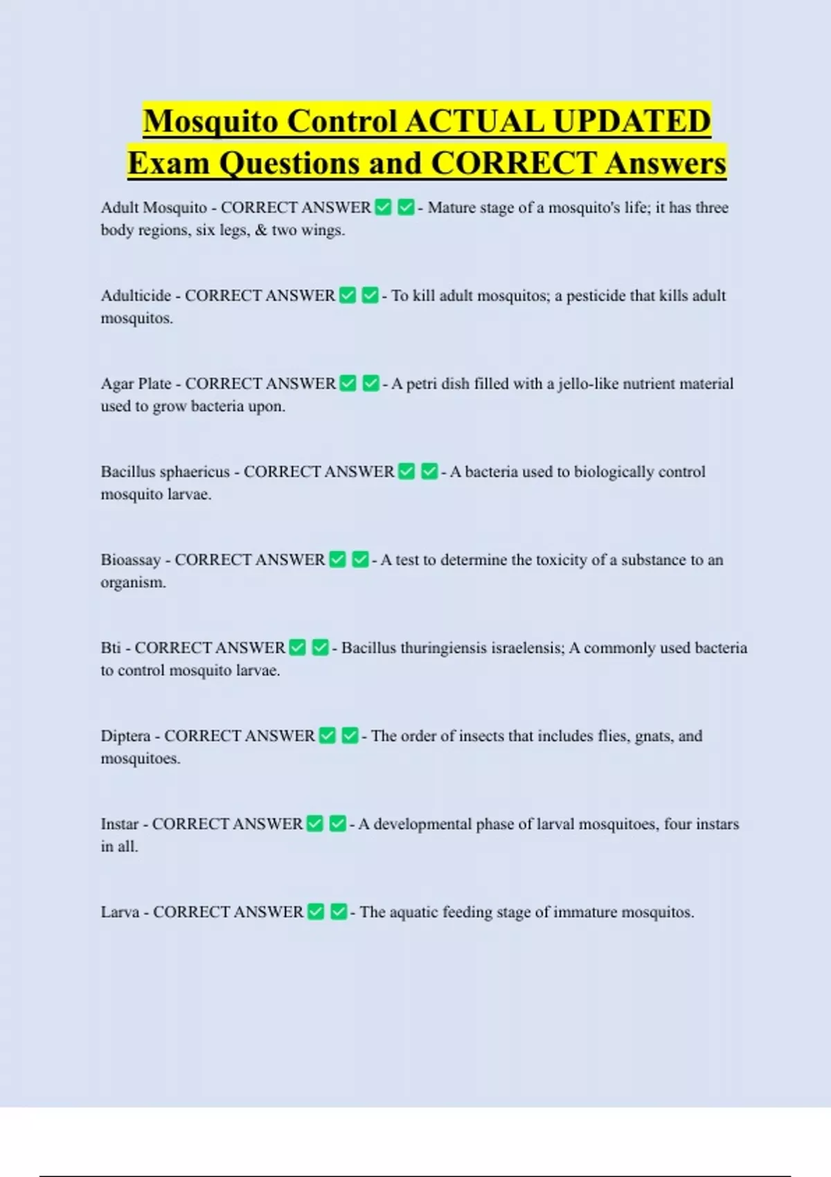 Mosquito Control ACTUAL UPDATED Exam Questions and CORRECT Answers
