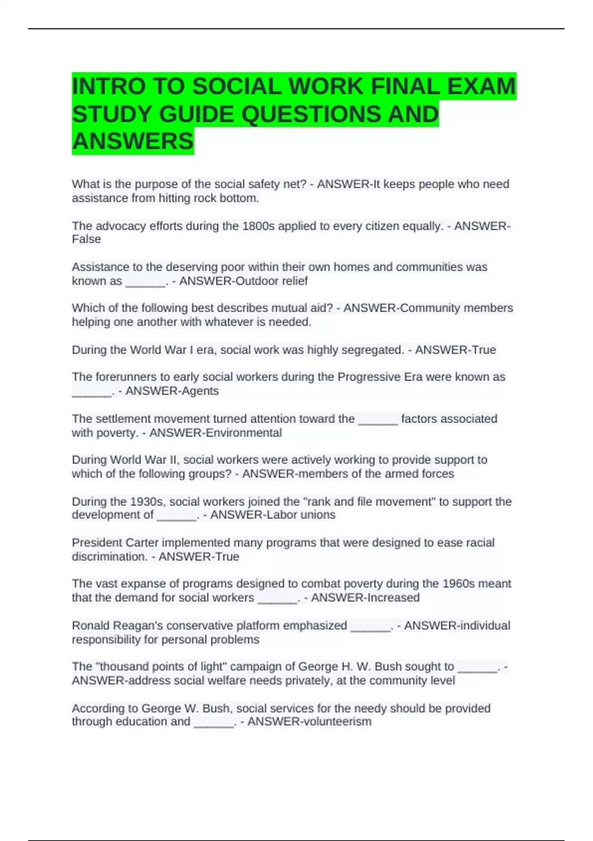 INTRO TO SOCIAL WORK FINAL EXAM STUDY GUIDE QUESTIONS AND ANSWERS