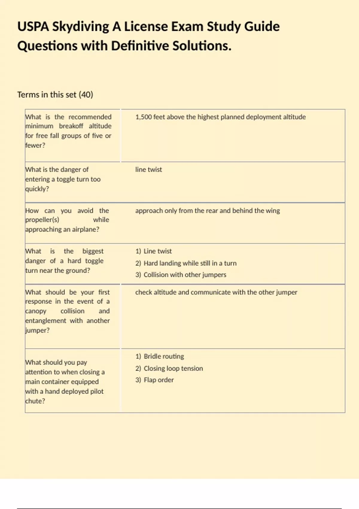 USPA Skydiving A License Exam Study Guide Questions with Definitive Solutions.