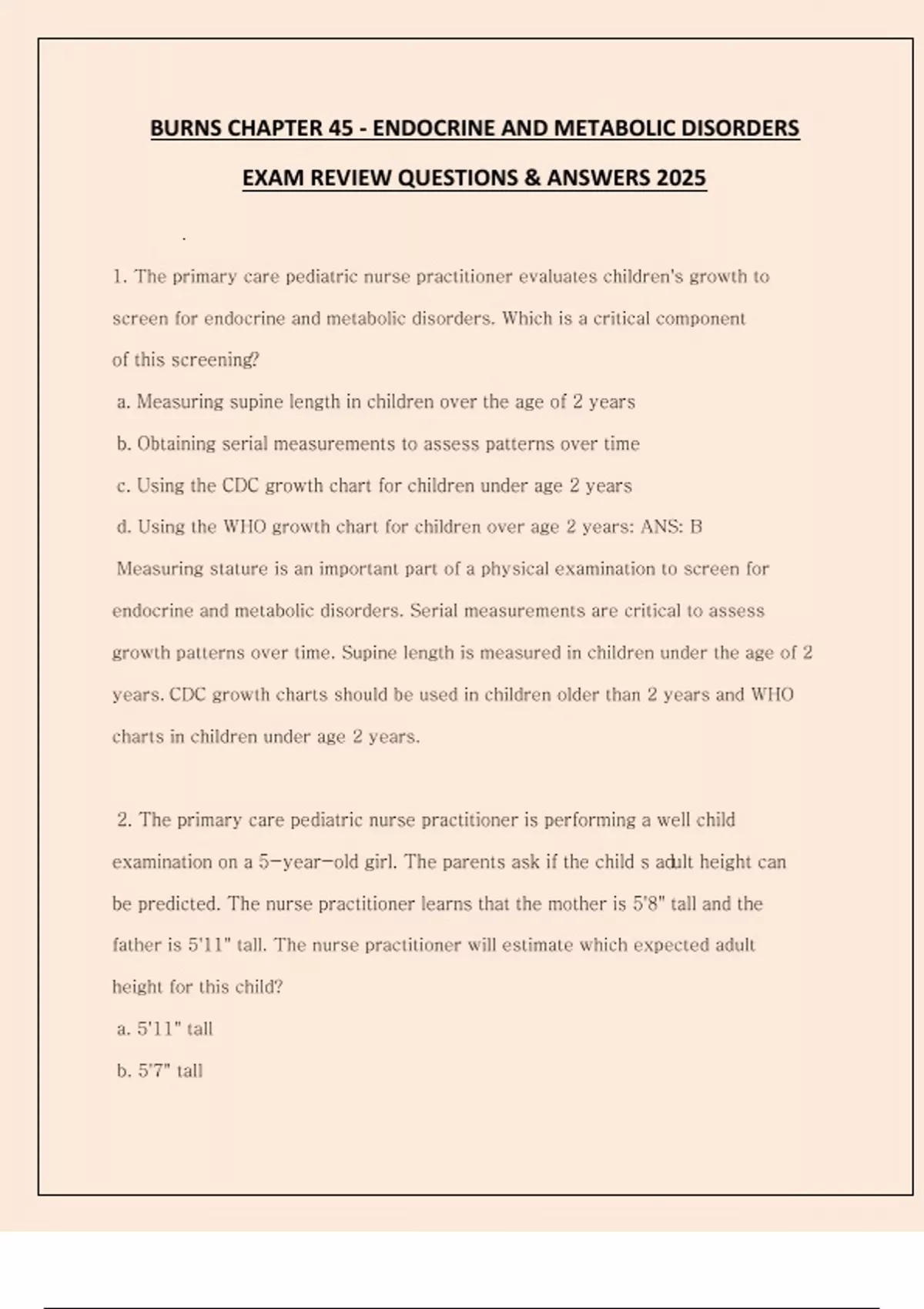 BURNS CHAPTER 45 - ENDOCRINE AND METABOLIC DISORDERS EXAM REVIEW QUESTIONS & ANSWERS 2025 1. The primary care pediatric nurse practitioner evaluates children's growth to screen for endocrine and metabolic disorders. Which is a critical component of this screening? a. Measuring supine length in children over the age of 2 years b. Obtaining serial measurements to assess patterns over time c. Using the CDC growth chart for children under age 2 years d. Using the WHO growth chart for children over age 2 years: ANS: B Measuring stature is an important part of a physical examination to screen for endocrine and metabolic disorders. Serial measurements are critical to assess growth patterns over time. Supine length is measured in children under the age of 2 years. CDC growth charts should be used in children older than 2 years and WHO charts in children under age 2 years. 2. The primary care pediatric nurse practitioner is performing a well child examination on a 5-year-old girl. The parents ask if the child s adult height can be predicted. The nurse practitioner learns that the mother is 5'8" tall and the father is 5'11" tall. The nurse practitioner will estimate which expected adult height for this child? a. 5'11" tall b. 5'7" tall c. 5'8" tall d. 6' tall: ANS: B Calculation of expected adult height for a girl is: [(Father s height - 5 in.) + (Mother s