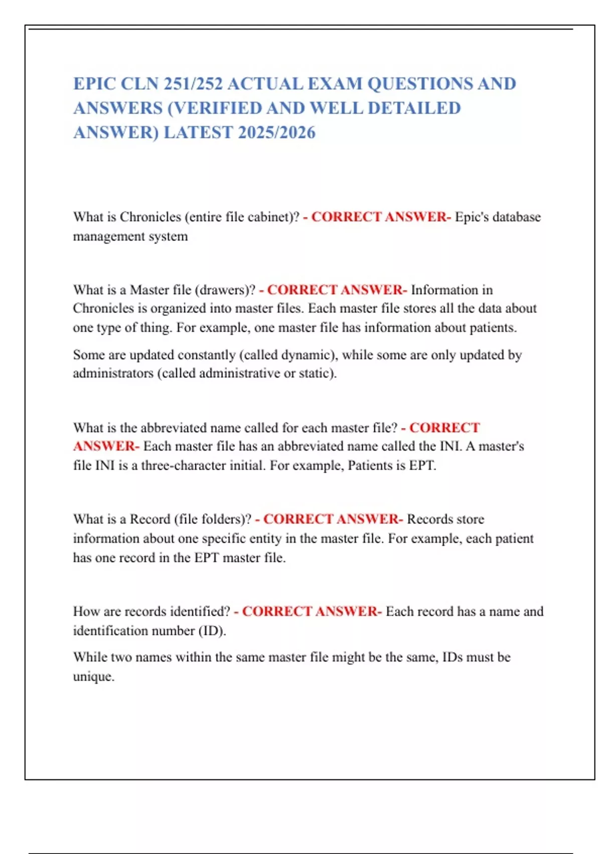 EPIC CLN 251/252 ACTUAL EXAM QUESTIONS AND