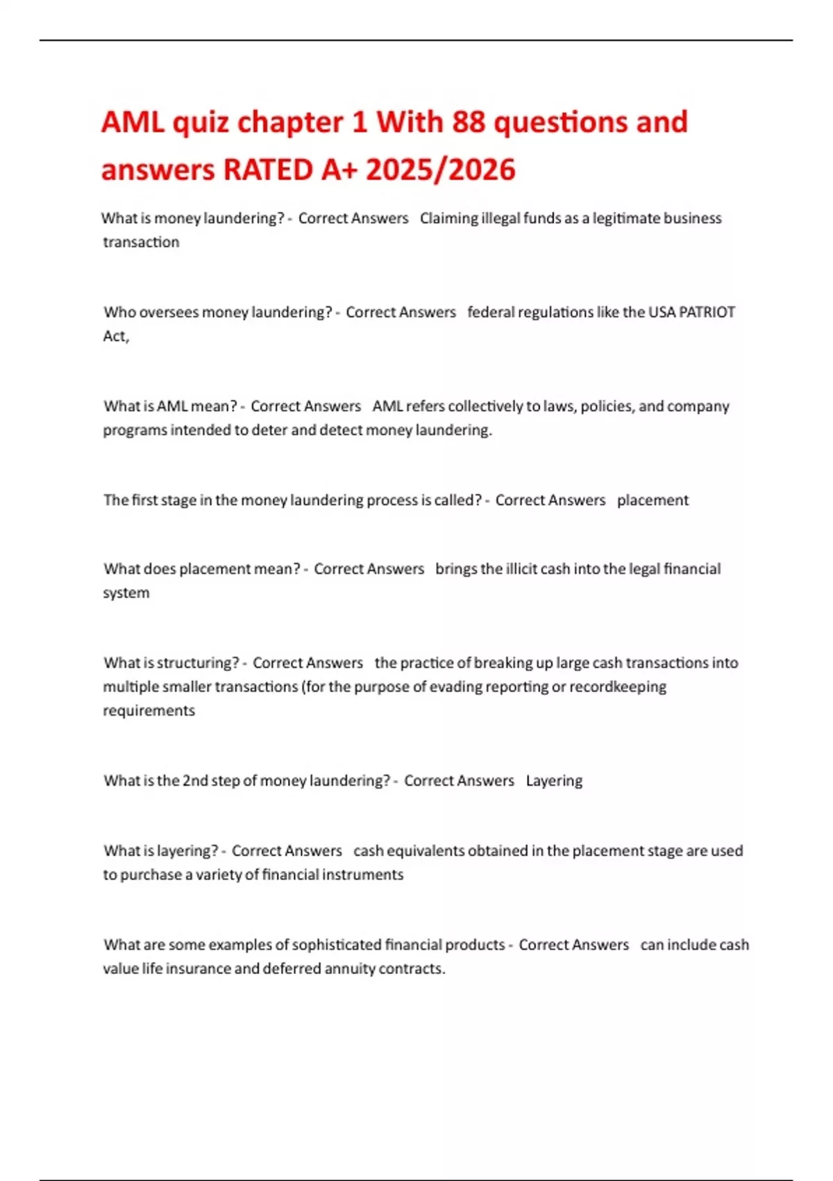 AML quiz chapter 1 With 88 questions and answers RATED A+ 2025/2026