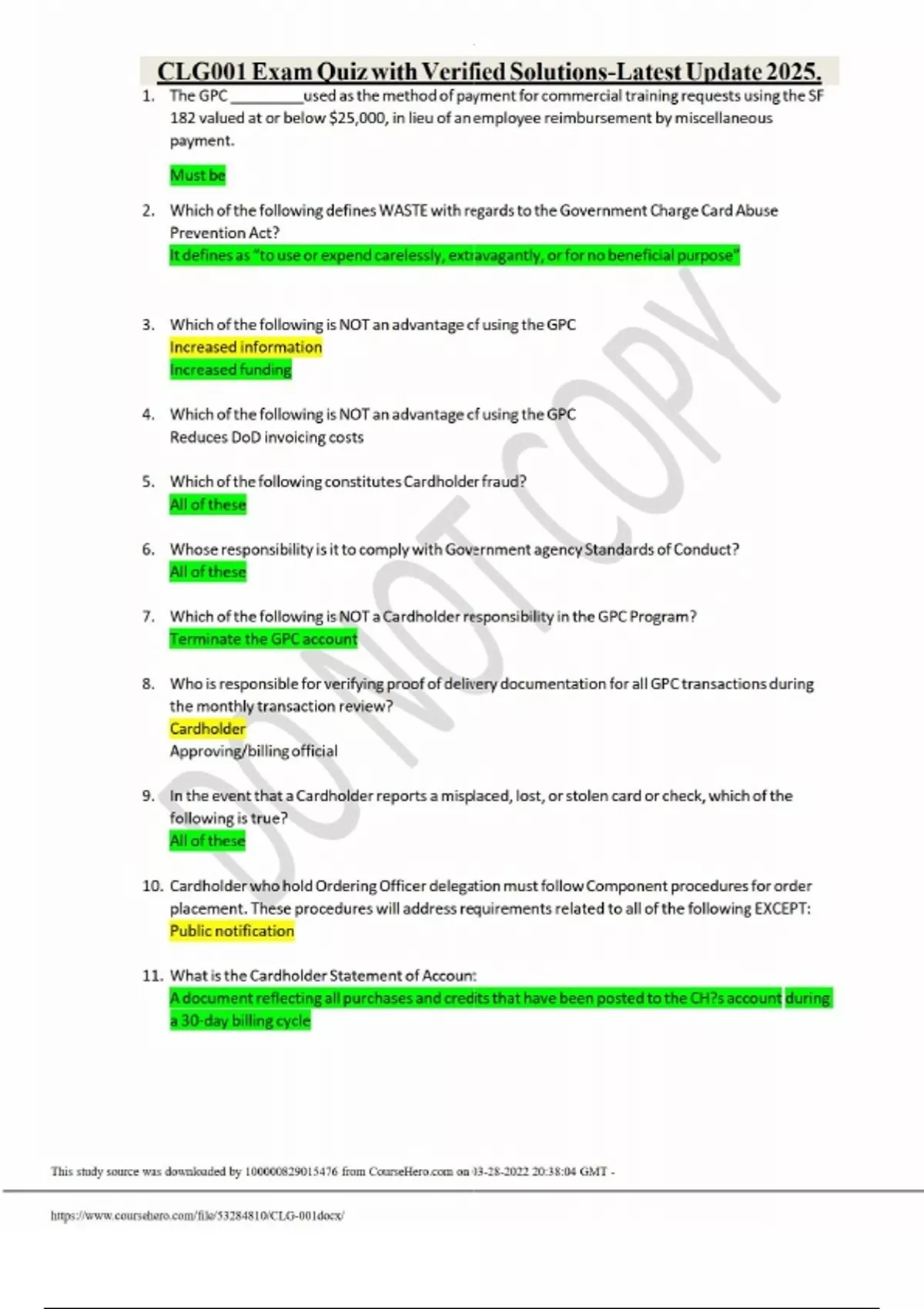 1. The GPC used as the method of payment for commercial training requests using the SF 182 valued at or below $25,000, in lieu of an employee reimbursement by miscellaneous payment. Must be 2. Which of the following defines WASTE with regards to the Government Charge Card Abuse Prevention Act? It defines as “to use or expend carelessly, extravagantly, or for no beneficial purpose” 3. Which of the following is NOT an advantage of using the GPC Increased information Increased funding 4. Which of the following is NOT an advantage of using the GPC Reduces DoD invoicing costs