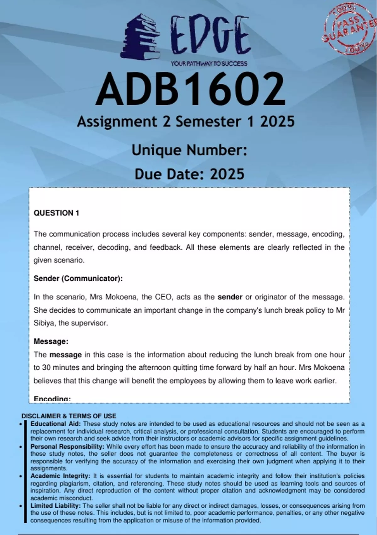 ADB1602 Assignment 2 (ANSWERS) Semester 1 2025 - DISTINCTION GUARANTEED