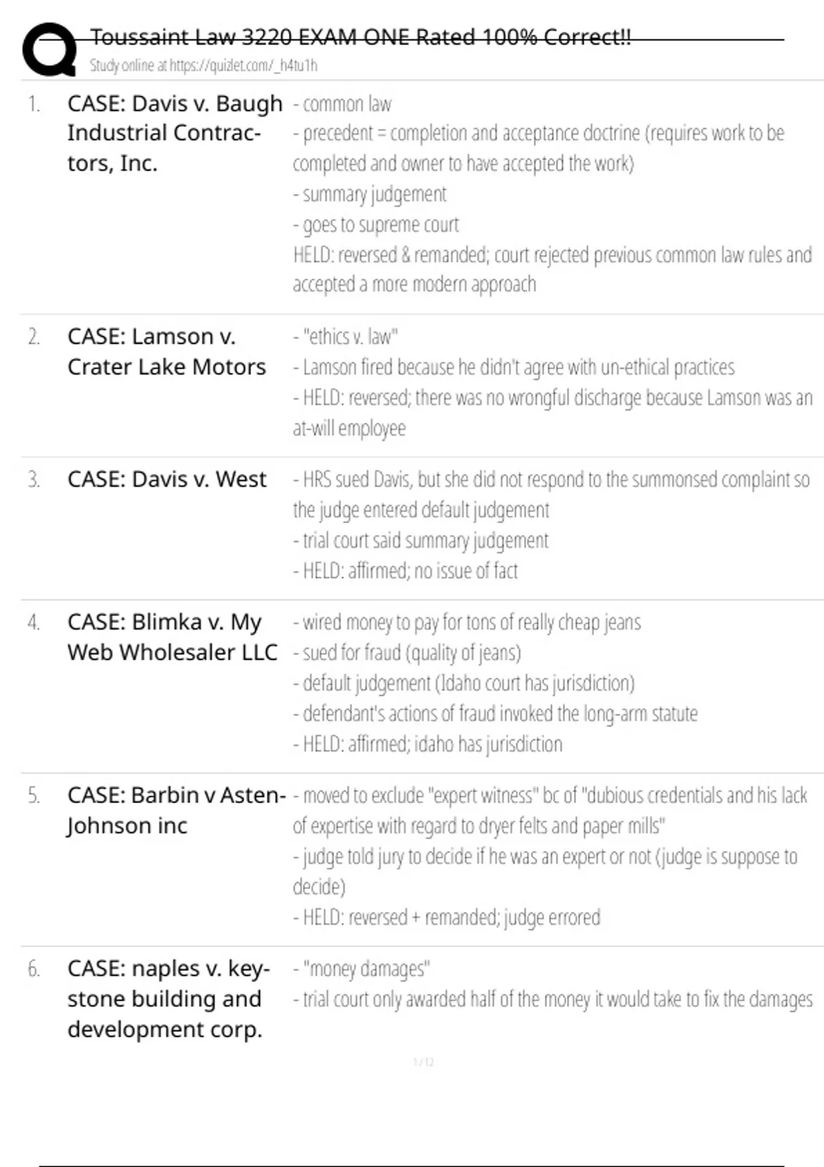 , Toussaint Law 3220 EXAM ONE Rated 100% Correct!!
