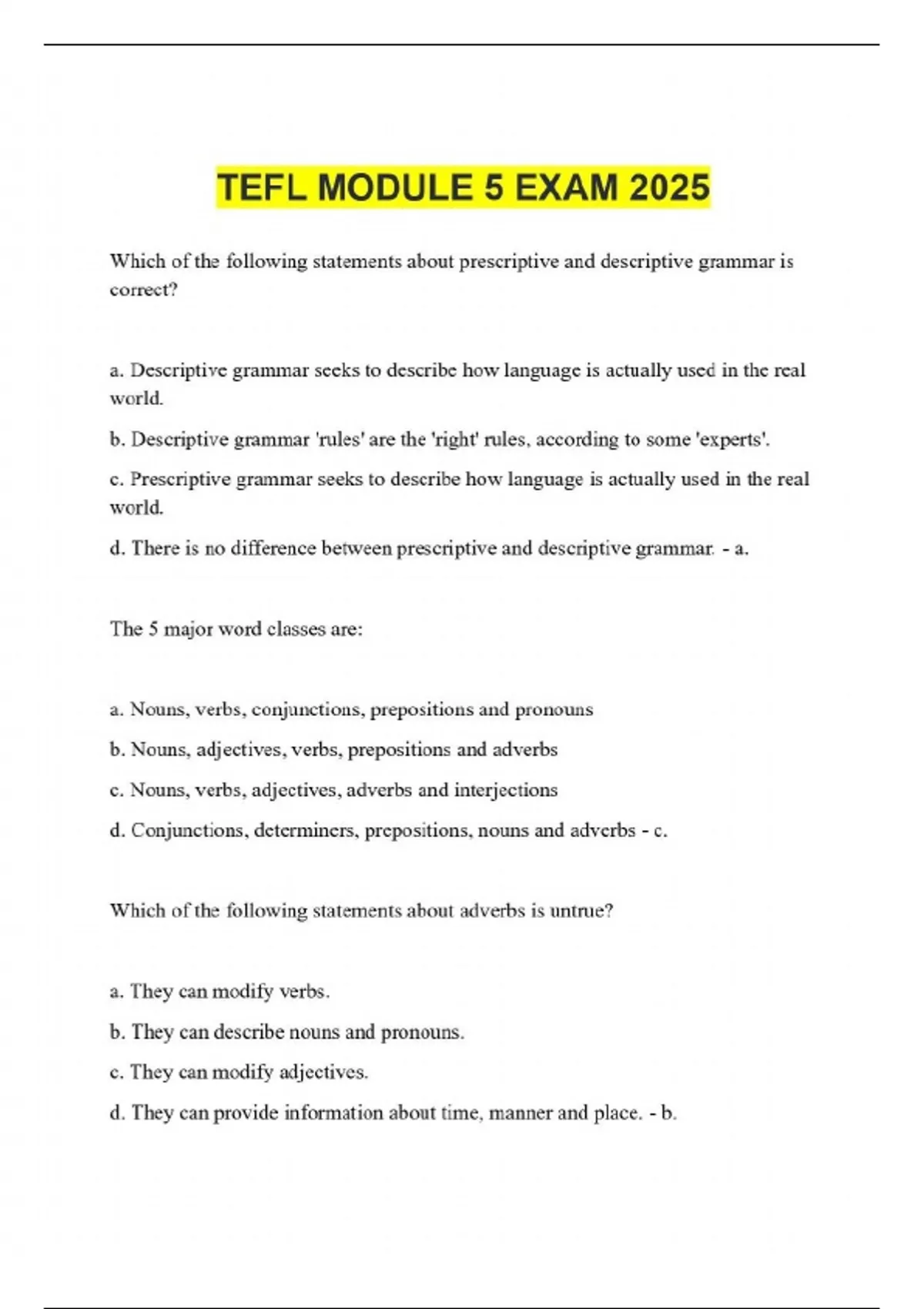 Which of the following statements about prescriptive and descriptive grammar is correct? a. Descriptive grammar seeks to describe how language is actually used in the real world. b. Descriptive grammar 'rules' are the 'right' rules, according to some 'experts'. c. Prescriptive grammar seeks to describe how language is actually used in the real world. d. There is no difference between prescriptive and descriptive grammar. - a. The 5 major word classes are: a. Nouns, verbs, conjunctions, prepositions and pronouns b. Nouns, adjectives, verbs, prepositions and adverbs c. Nouns, verbs, adjectives, adverbs and interjections d. Conjunctions, determiners, prepositions, nouns and adverbs - c. Which of the following statements about adverbs is untrue? a. They can modify verbs. b. They can describe nouns and pronouns. c. They can modify adjectives. d. They can provide information about time, manner and place. - b.