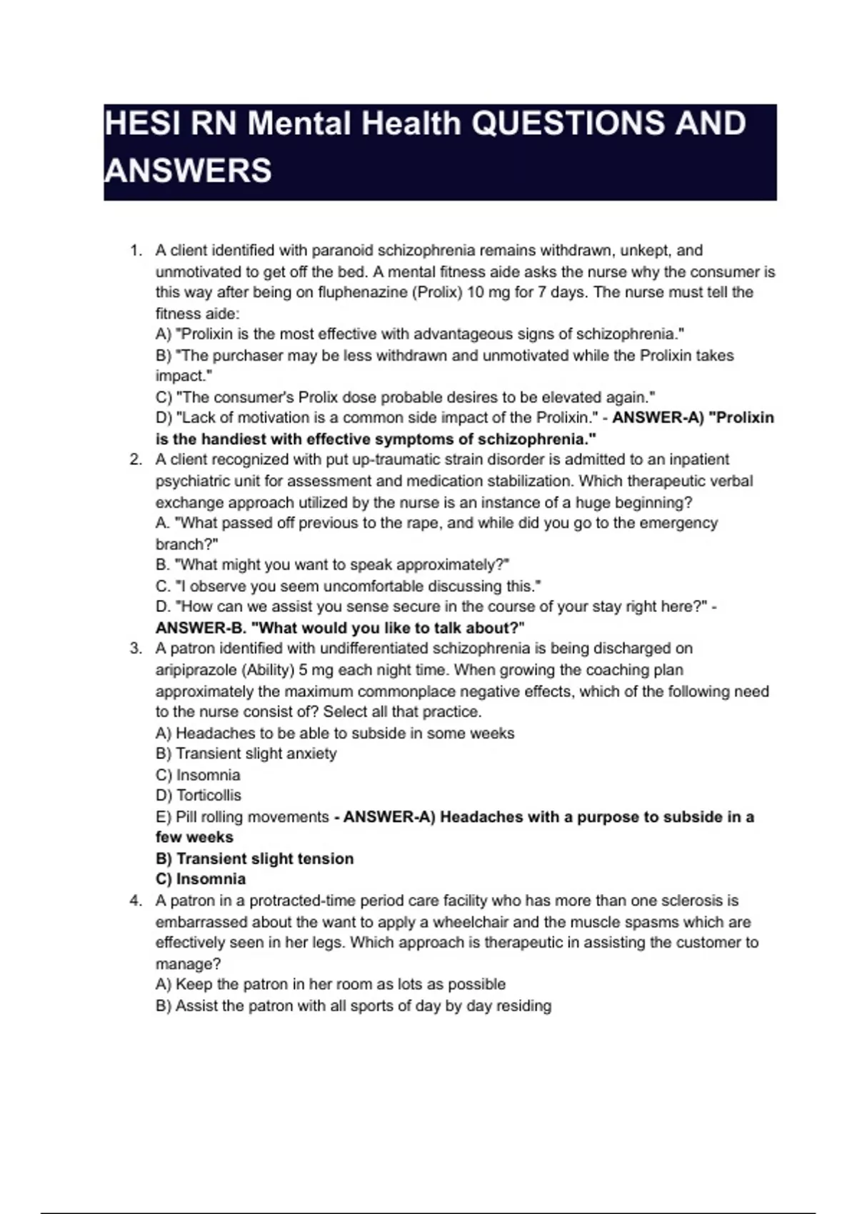 HESI RN Mental Health QUESTIONS AND