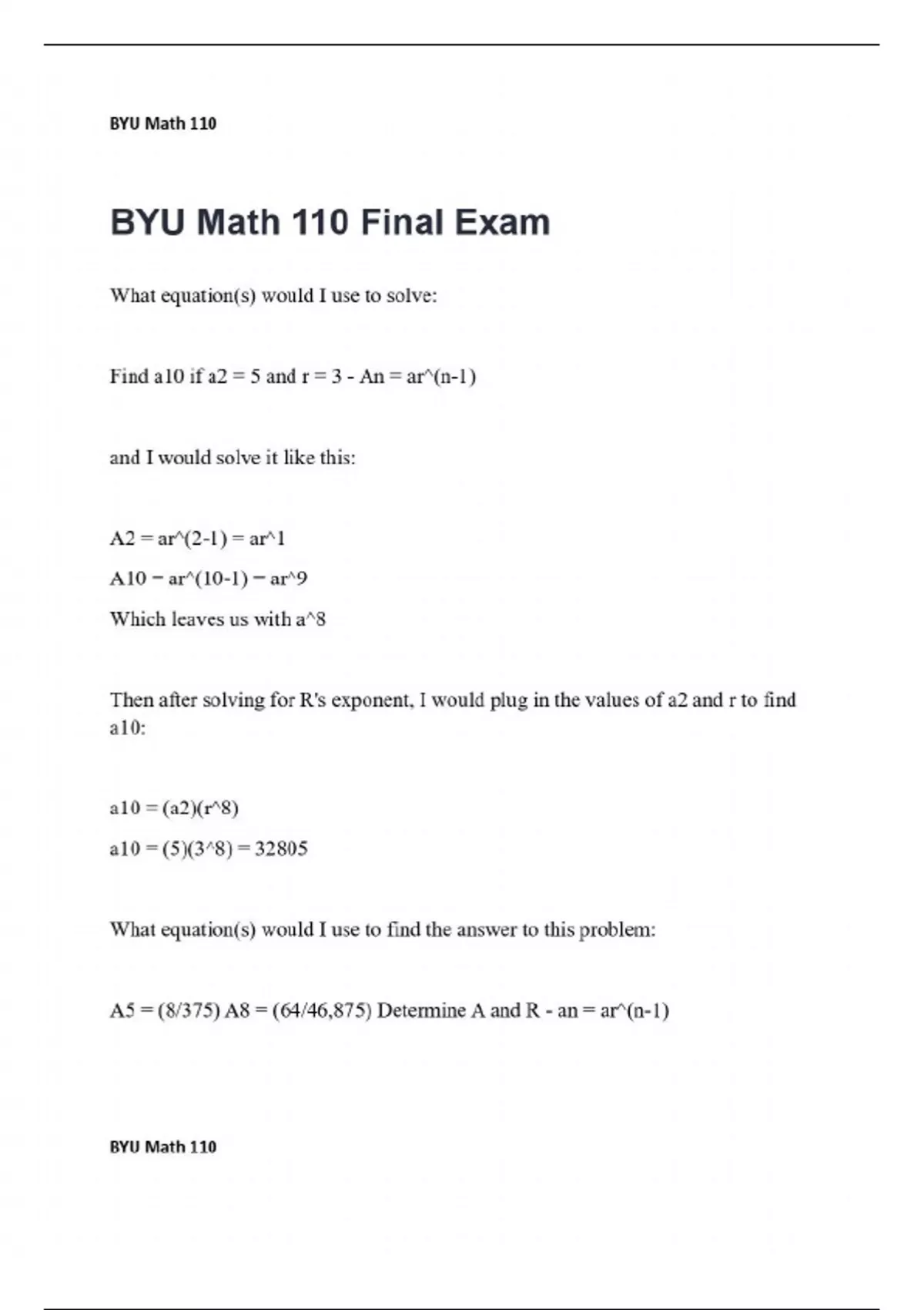 What equation(s) would I use to solve: Find a10 if a2 = 5 and r = 3 - An = ar^(n-1) and I would solve it like this: A2 = ar^(2-1) = ar^1 A10 = ar^(10-1) = ar^9 Which leaves us with a^8 Then after solving for R's exponent, I would plug in the values of a2 and r to find a10: a10 = (a2)(r^8) a10 = (5)(3^8) = 32805 What equation(s) would I use to find the answer to this problem: A5 = (8/375) A8 = (64/46,875) Determine A and R - an = ar^(n-1) First I'd solve for r by diving the equation for a8 by the equation for a5. (64/46875) = ar^(8-1) = ar^7 divided by (8/375) = ar^5-1 = ar^4 Therefore: 8/125 = r^3 and r = 2/5 Once I have R, I'd solve for A by plugging R into one of the equations. So, a5 = (8/375) = a(2/5)^5-1 turns out to be: a = 5/6